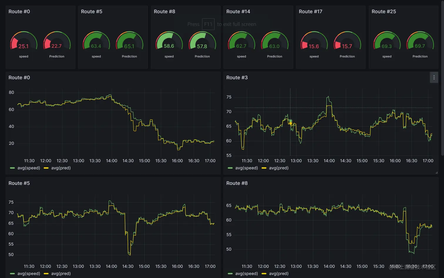 图中第一列是随机选取的几个传感器发送的实时数据和使用 gcrnn 模块推理得到的一小段时间之后的预测值。上面的 4 个折线图中,黄色曲线是 gcrnn 预测的通行速度,绿色曲线是实际的通行速度。可以看出,使用本例中的简单模型进行推理得到的预测结果与实际数据还是比较接近的。