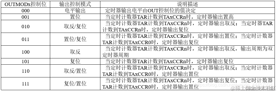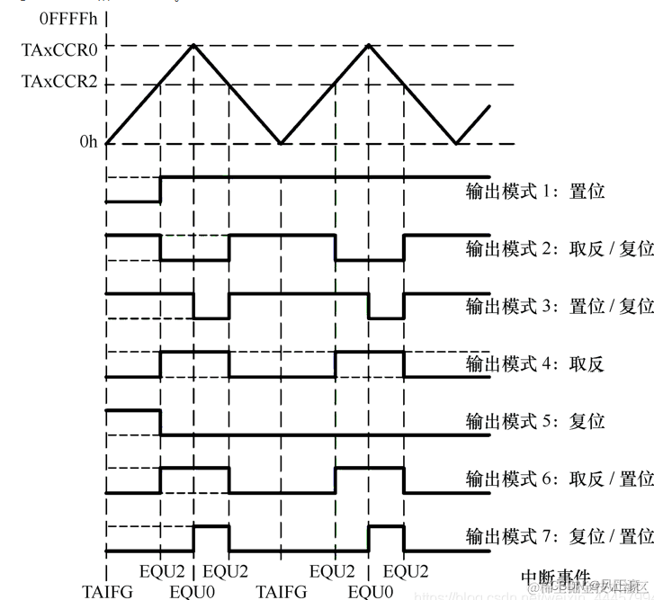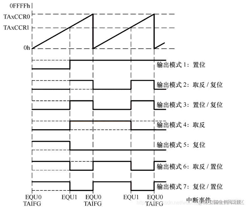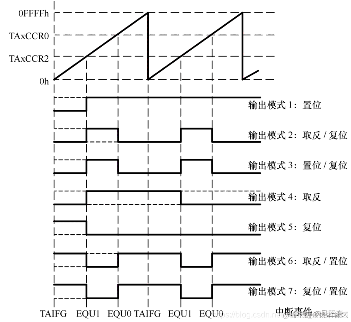 在增计数模式下,当TAR增加到TAxCCRn或从TAxCCR0计数到0时,定时器输出信号按选择的输出模式发生变化。示例如图所示,该示例利用了TAxCCR0和TAxCCR1。