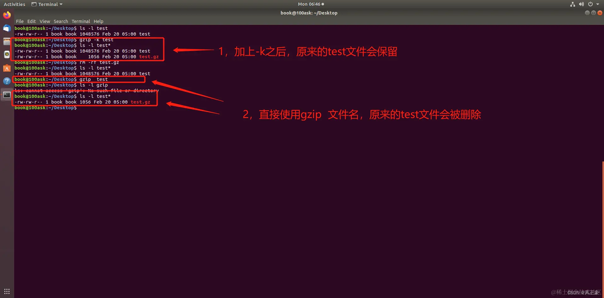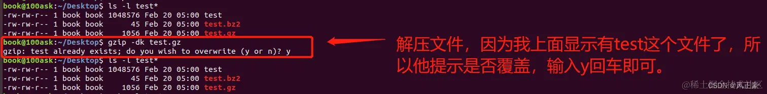 gzip -dk 文件名:解压文件。如果有相同文件名的文件,将会提示覆盖。
