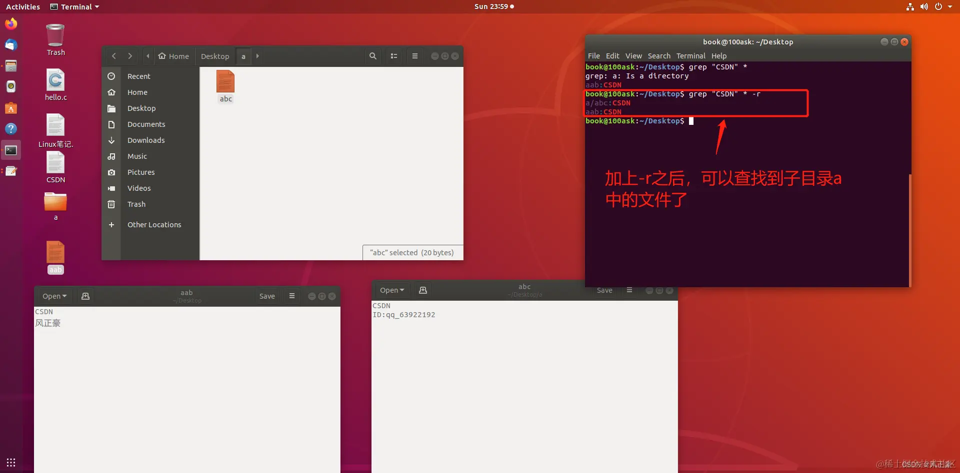 从上面我们可以知道,如果常规写法,不能够查找子目录的文件内容。所以,当我们想查找当前目录下的所有文件内容,需要加上-r。