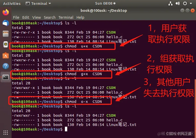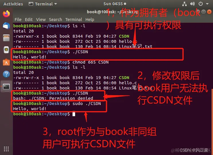 注意:root用户在root组,book用户在book组。所以我将更改权限为665(110 110 101)进行实验。