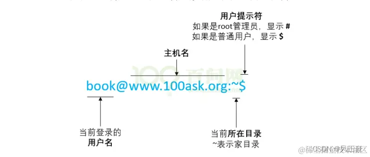 1,首先@之前的是表示当前登录的用户名,如果你是按照韦东山老师的视频安装的,应该都是book用户。但是如果是按照别的教学视频来的,可能名字不一样,没太大关系。