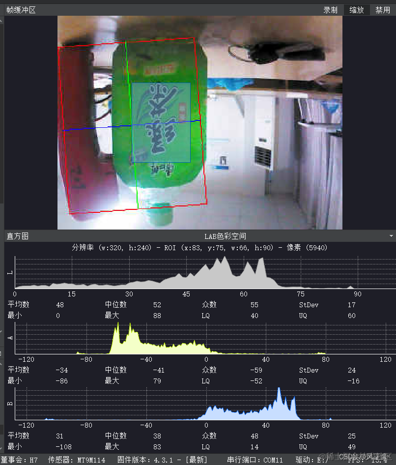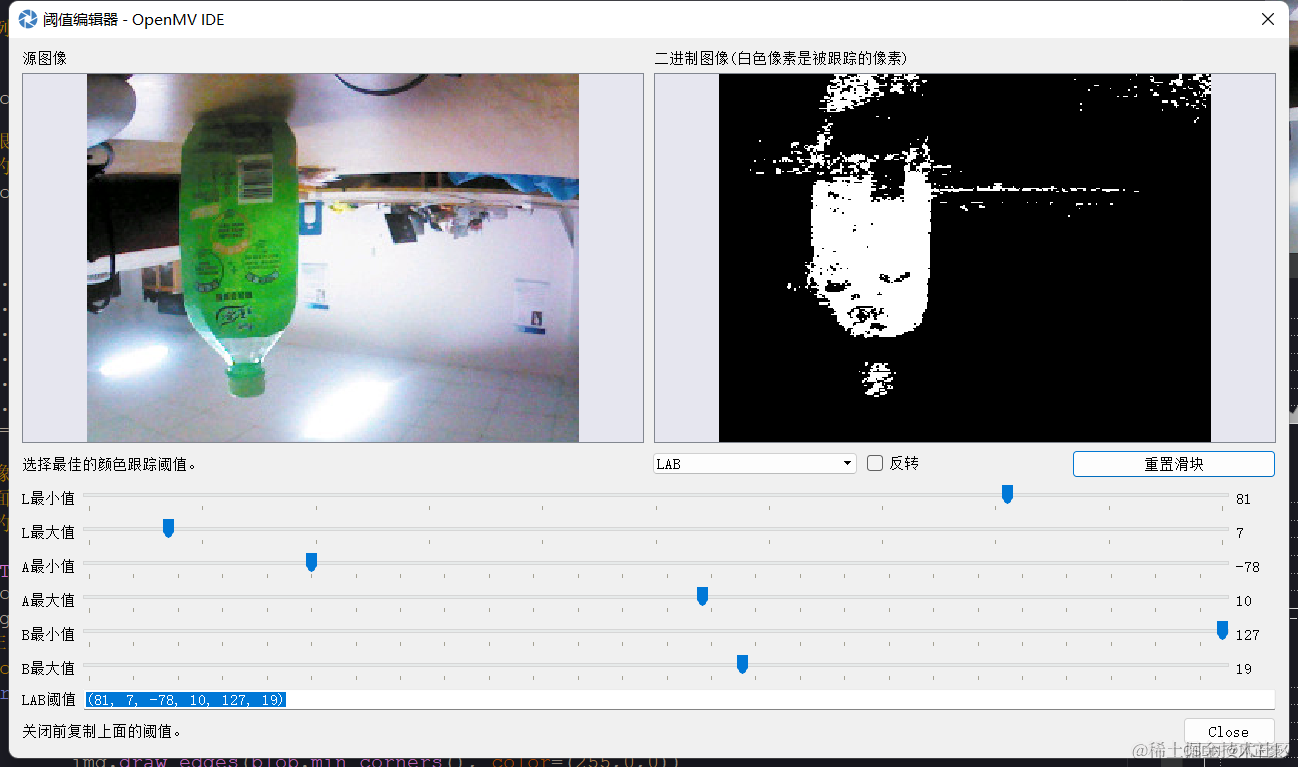 根据直立方图的值,我们调整LAB最大和最小值,尽可能的让要目标识别对象变成全白色。(注:即使没有全部变成白色也不影响,反正最后会把所有没有被滤除的白色区域变成一个大框)然后复制下方的LAB阈值。