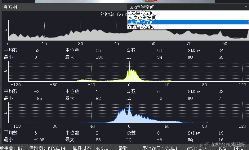 打开OpenMV IDE软件——>右下角有一个直立方图——>颜色识别中,只需要用到LAB色彩空间。