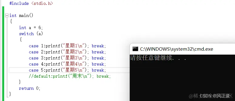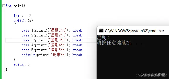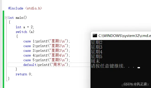 很明显,我们发现他输出了星期2—星期5和周末。这就是我们上面说的程序就直接跳到case 2:然后依次执行后面的所有内容!