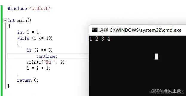 我们说了,结束continue后面的语句,重新开始进行进行while判断。但是因为i=i+1放在了continue后面,那么i=5成立的时候,i永远不会自增,这就导致i永远会是5,while语句的i<=10永远成立,从而进入一个死循环。