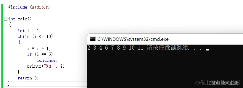 这个是为什么呢?因为while中是先进行i自增,再打印,所以是2-11的数字,并且i自增不能写在continue之后,不然会进入死循环。(上面讲了)但是for不一样,这个i的自增是执行完for里面的内容之后再进行的。这个i自增不属于for里面的内容,不会被continue给省略掉。