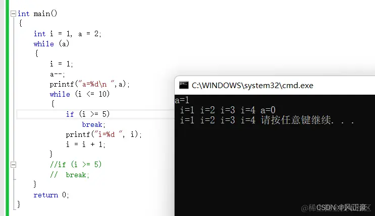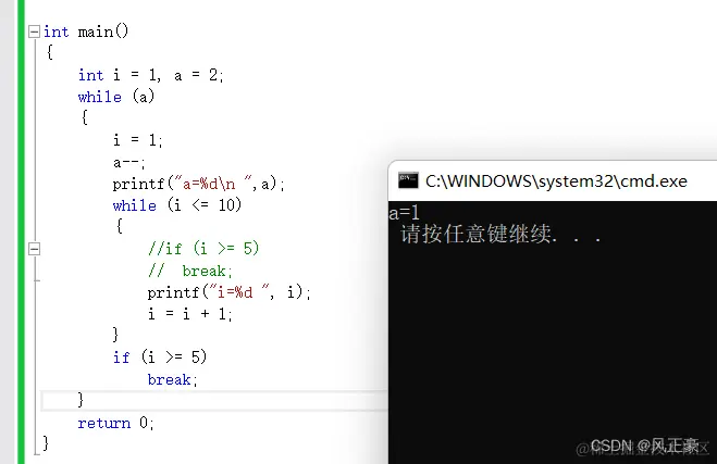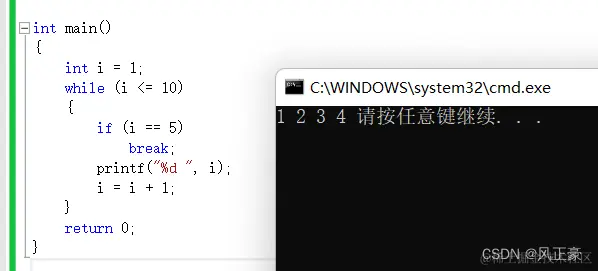 可以看到,程序就输出了1,2,3,4。但是没有输出5和接下来的数字。这就是因为break在作用。当i=5的时候,进入if语句,然后break结束当前while循环。需要注意,break只会匹配最近while或者switch。