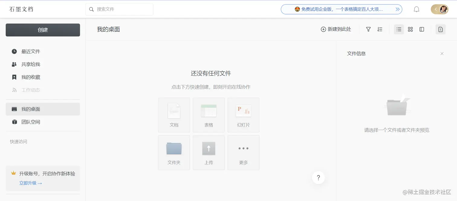 - **颜值高、页面简洁好上手。**石墨文档页面的配色以石墨色和白色为主,整个画面给人的感觉就很简洁大方,页面布局也一目了然,方便上手
