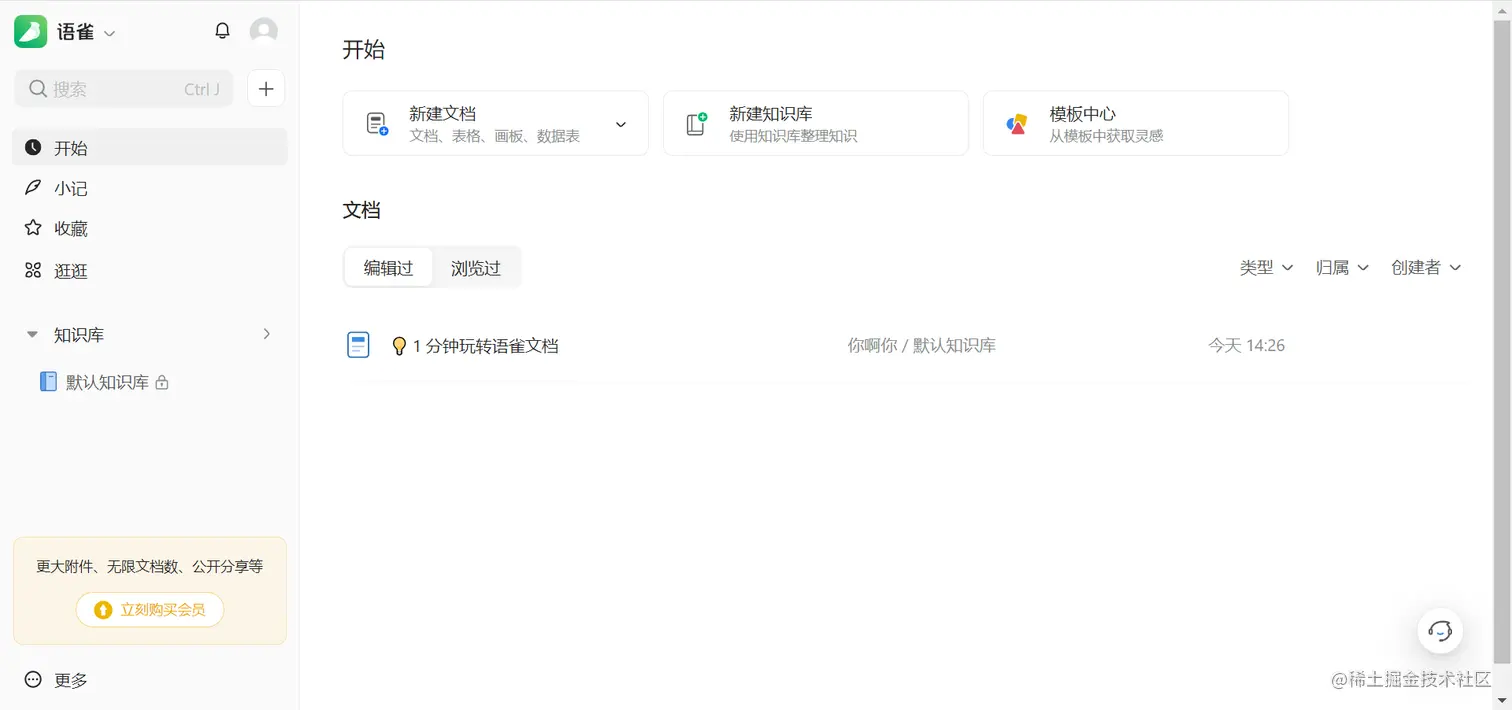 语雀是蚂蚁集团旗下的在线文档编辑与协同工具,与其他产品可以随意建立文档不同,语雀上的每一篇文档必须属于某一个知识库,语雀希望通过这样的产品设计,来从源头上帮助用户建立起知识管理的意识,培养良好的知识管理习惯。