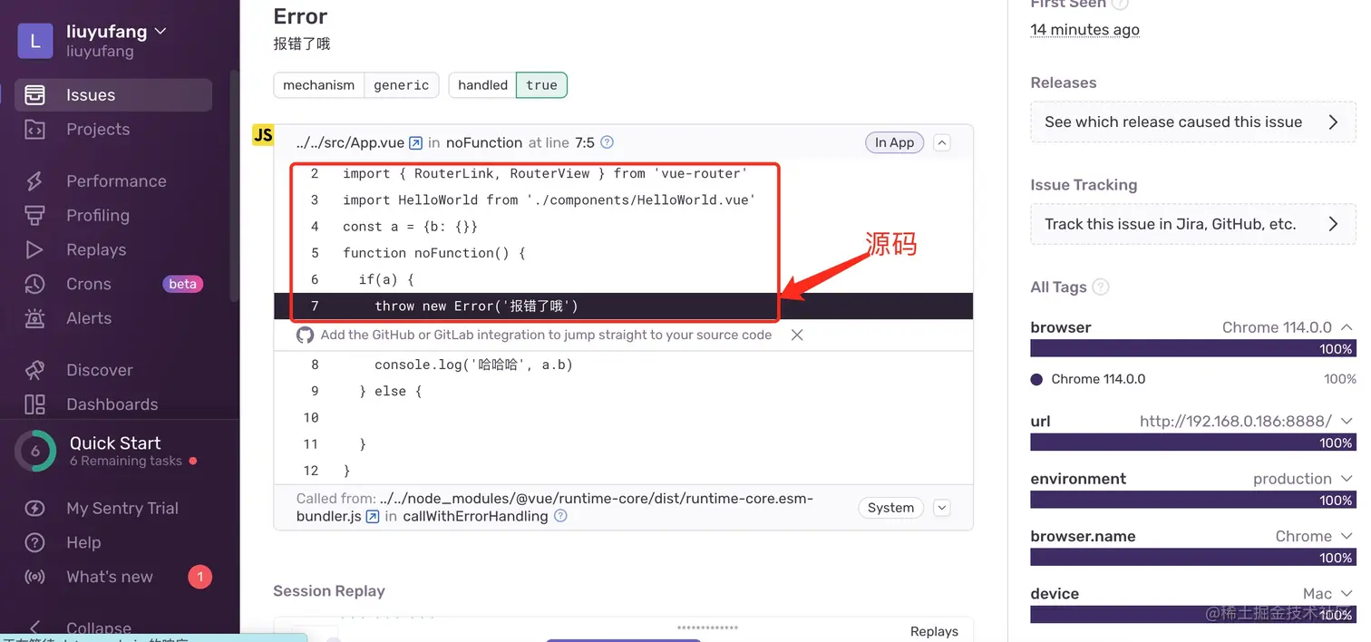 step4.sentry后台也显示了报错信息,并且指向源代码