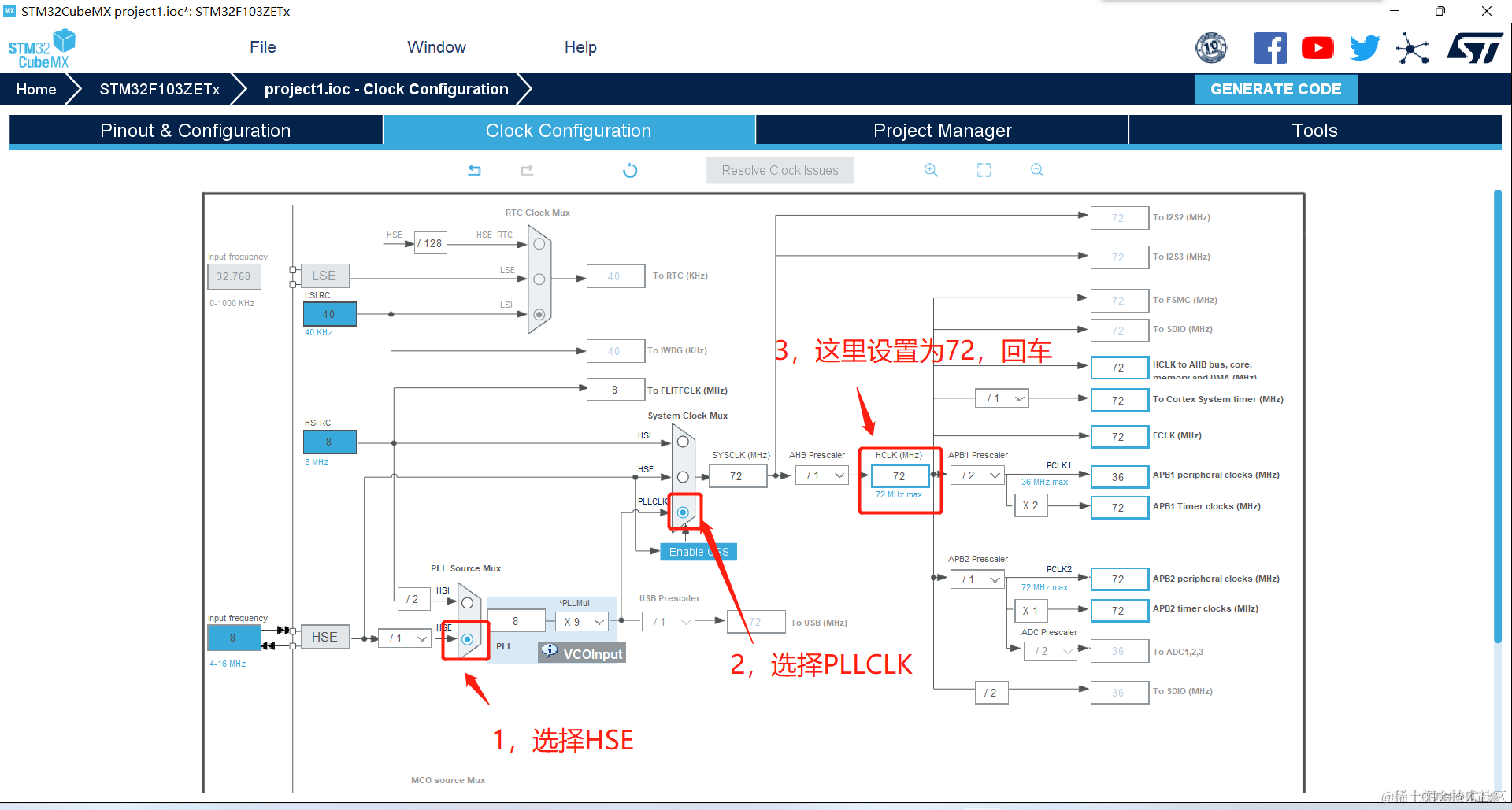 这里我只是配置常用的72MHZ主频,很多时候新手都在时钟树这里被劝退了。其实不知道没关系,我用STM32这么久了,也只知道大概。我们绝大多数时候不需要配置这个时钟,记住72MHZ主频配置即可。