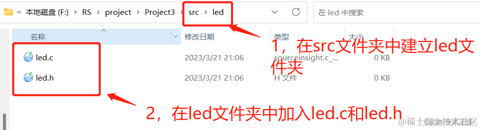 (3)首先我们在src文件夹中创建一个led文件夹,然后led中加入led.c和led.h文件。