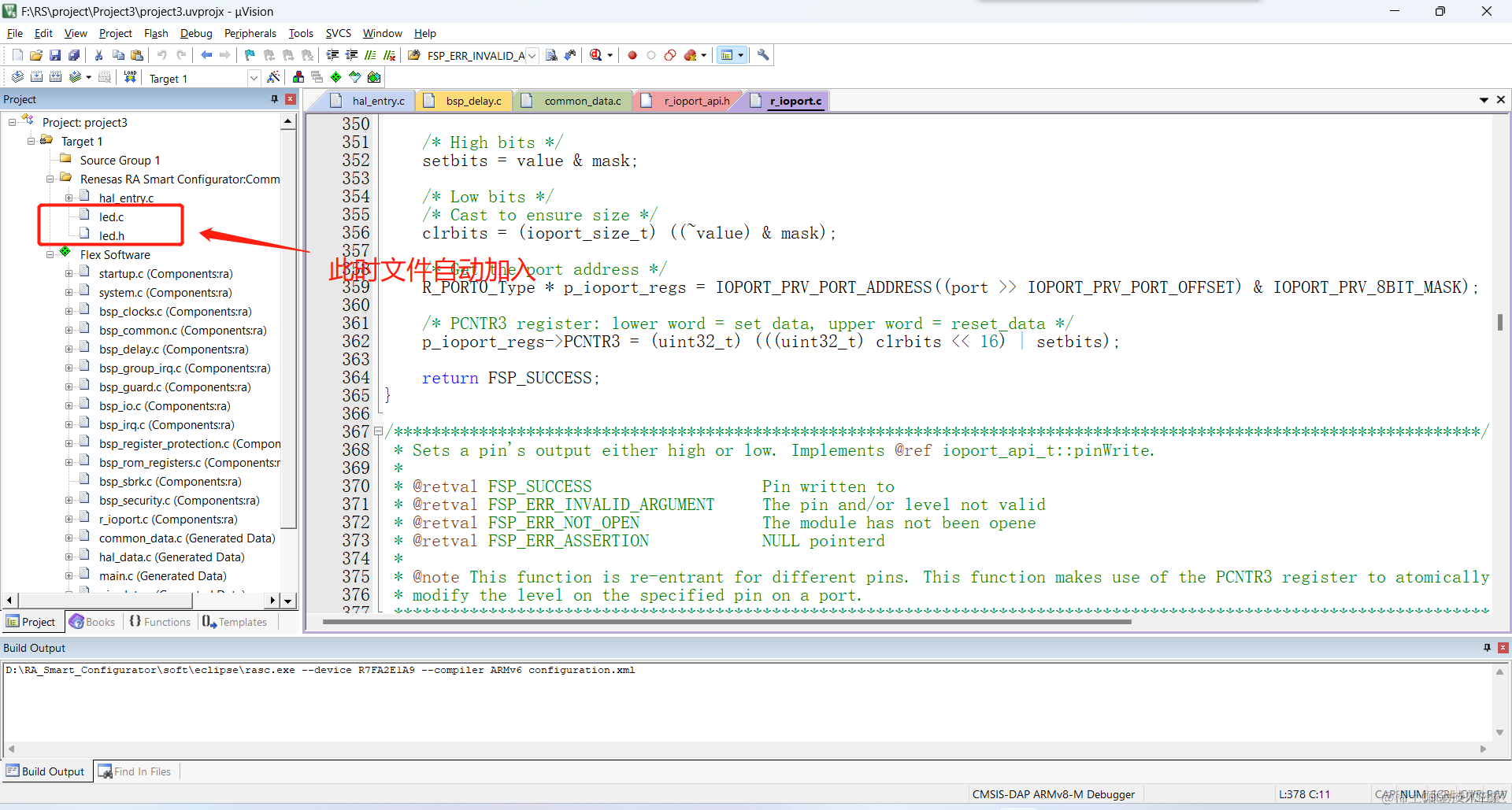 (4)当我们再次打开keil,发现led.c和led.h并没有加入工程。这就需要我们重新打开rasc——>点击“Generate Project Content”按钮 ——>然后关闭rasc。