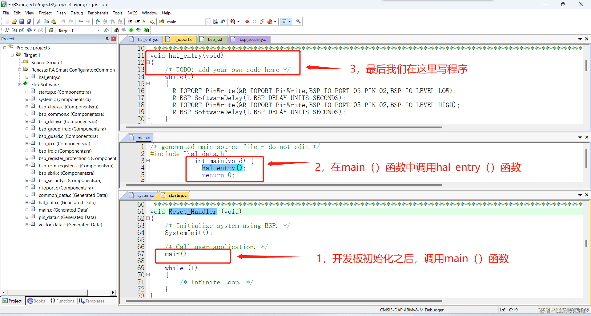 这是什么意思呢?很简单,如果我们使用了操作系统,就是从main()函数开始写,而如果是裸机开发,就是从hal_entry()函数开始。但是这个时候就有人问了开机启动的第一个程序不是Reset_Handler()吗?而Reset_Handler()中调用的是main()函数啊。为什么我们是要在hal_entry()函数中写程序呢?看下图