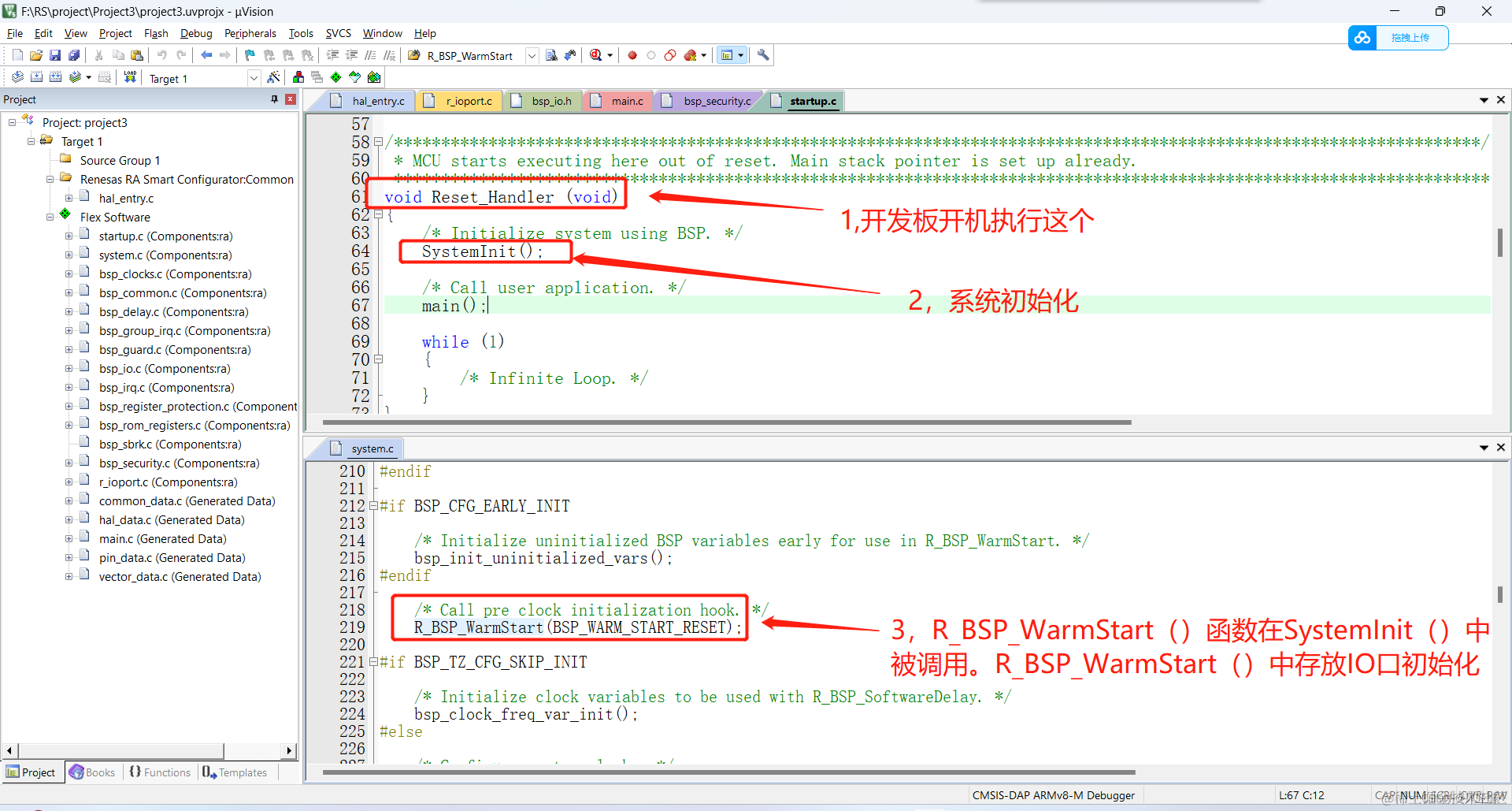 (2)这个时候有人会问了。什么变化呢?很简单,就是我们的IO初始化,会存放到R_BSP_WarmStart()函数中,而R_BSP_WarmStart()函数会被SystemInit()函数调用。