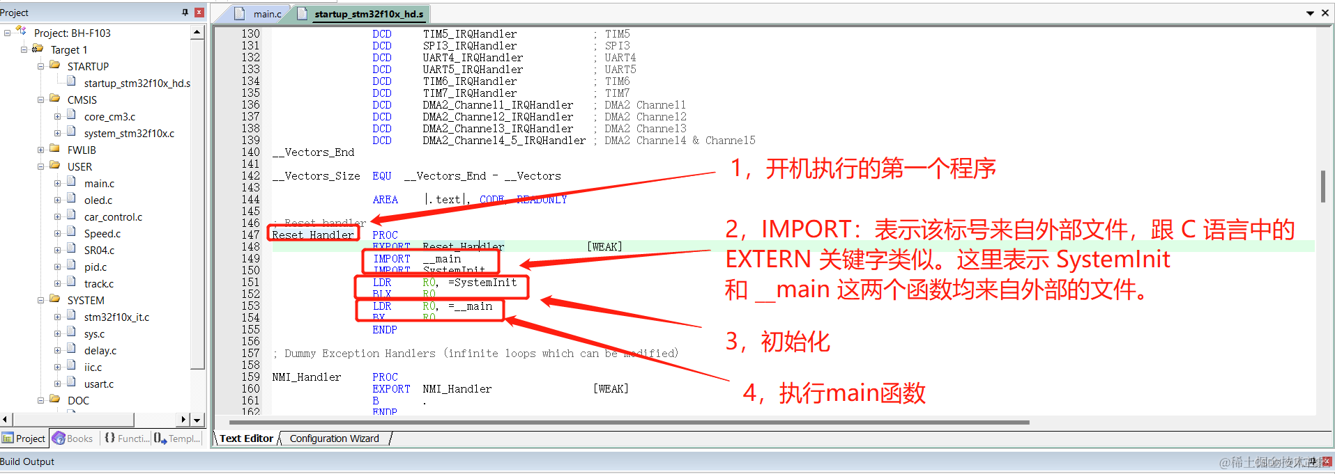 (3) IMPORT:表示该标号来自外部文件,跟 C 语言中的 EXTERN 关键字类似。这里表示 SystemInit 和 __main 这两个函数均来自外部的文件。