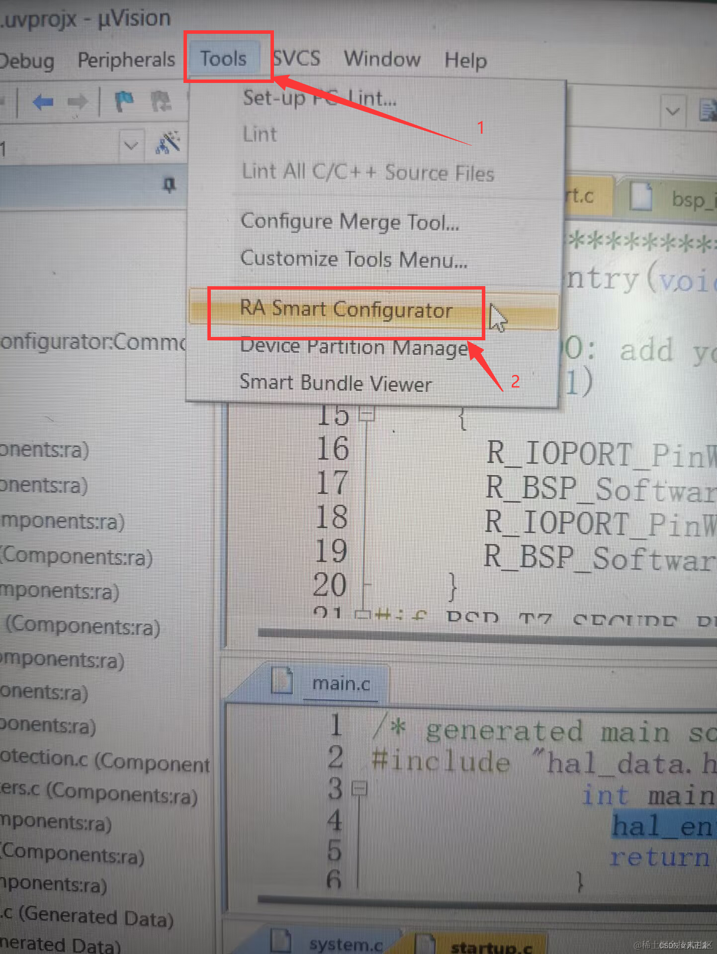(2)因为我们在上一章节已经将rasc添加进入keil中了,所以打开右上角的Tools,RA Smart Configurator。