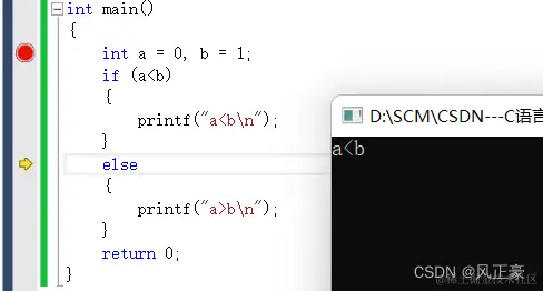 然后按F10或者F11进行调试。这两个有什么区别呢?F10被称为逐过程调试就是假如遇到了一个函数,按F10会直接执行这个函数。如下,在printf("a<b\n");的时候直接按F10,显示打印出来a<b。如果是在这里按F11会发生什么呢?
