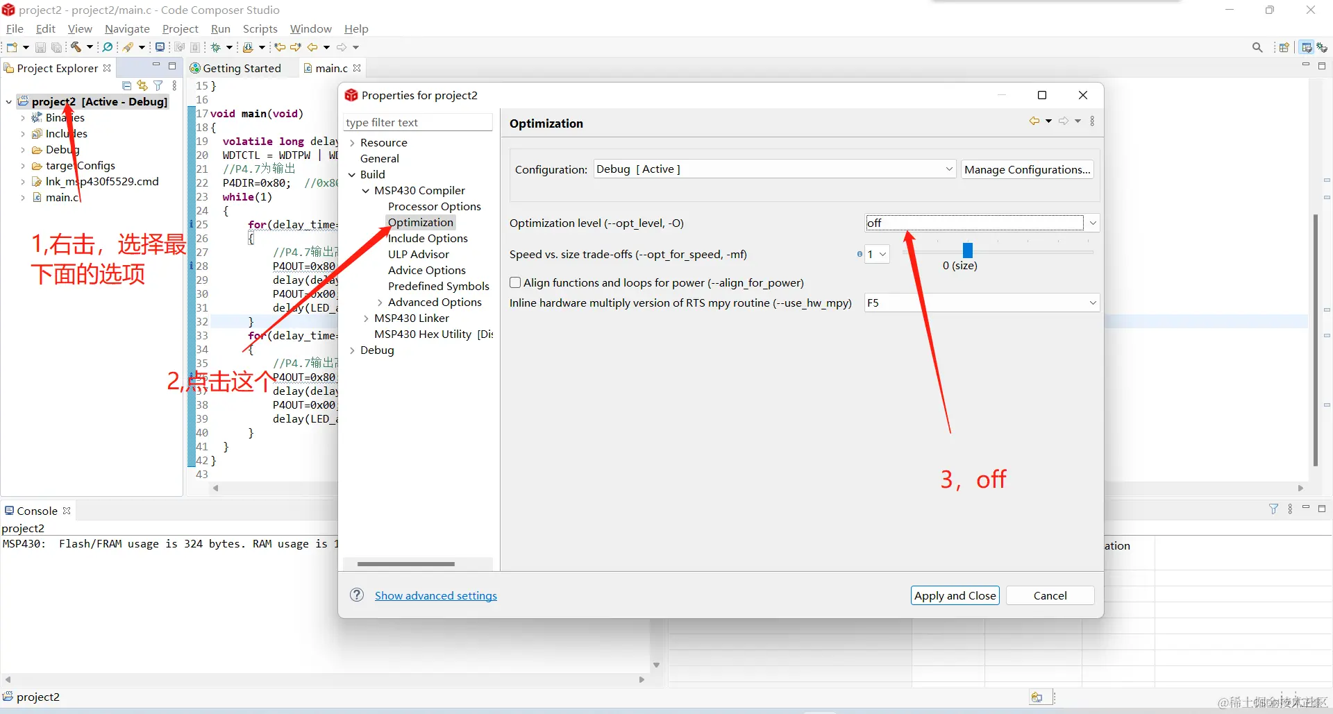 我们可以自己设置,鼠标靠近工程——>右键——>properties——>build——>MSP430 Compiler——>Optimizition——>Optimizition level(--opt_level,-O)——>选择off——>Apply and Close。