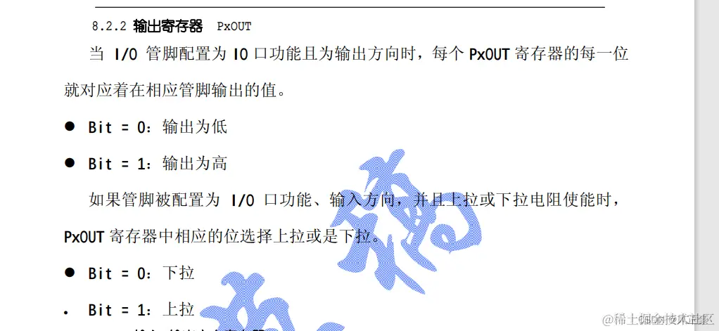 因为此处是输入,所以我们只需要看下面的IO输入部分。我们知道,bit=1为上拉输入。所以我们要将PxOUT的bit设置为1。