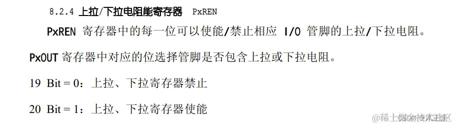 我们看数据手册可以知道,他需要配置一个PxREN的寄存器,来确认IO是否可以上下拉。很明显我们需要将IO进行上拉