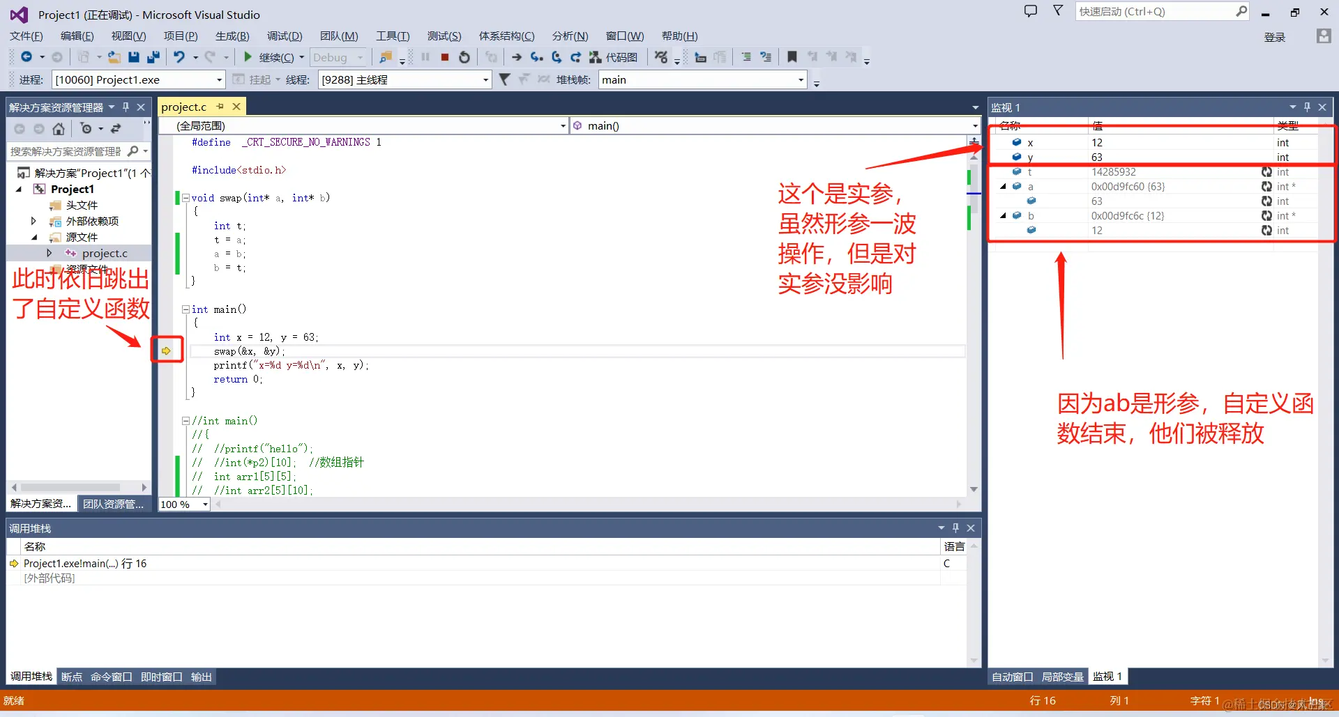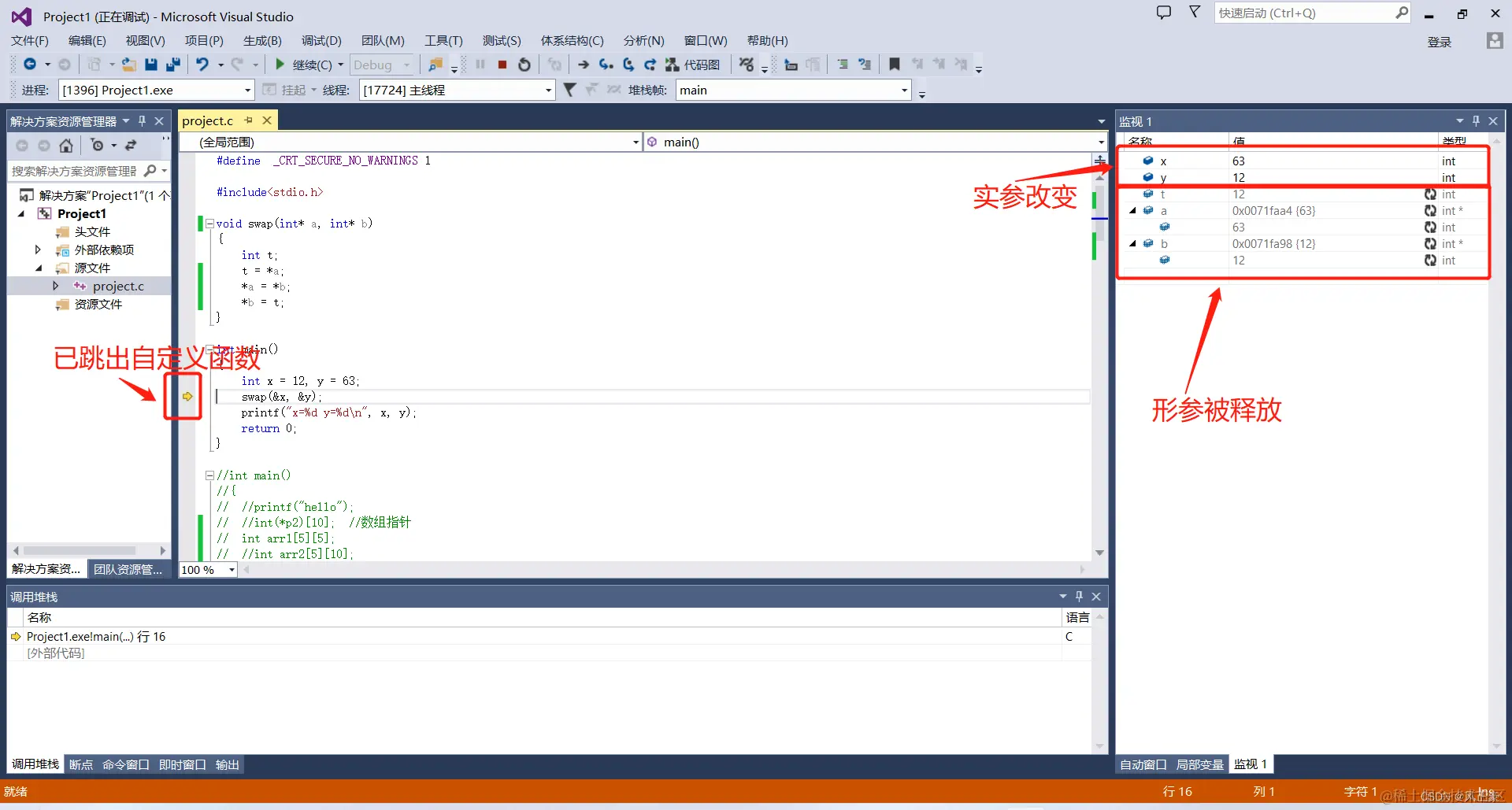 但是如果只是指针交换,那么随着形参的释放,这个指针交换并没有反应到实参当中。