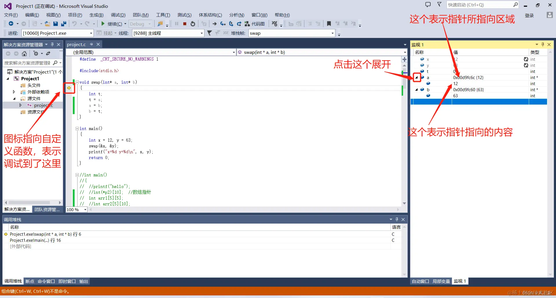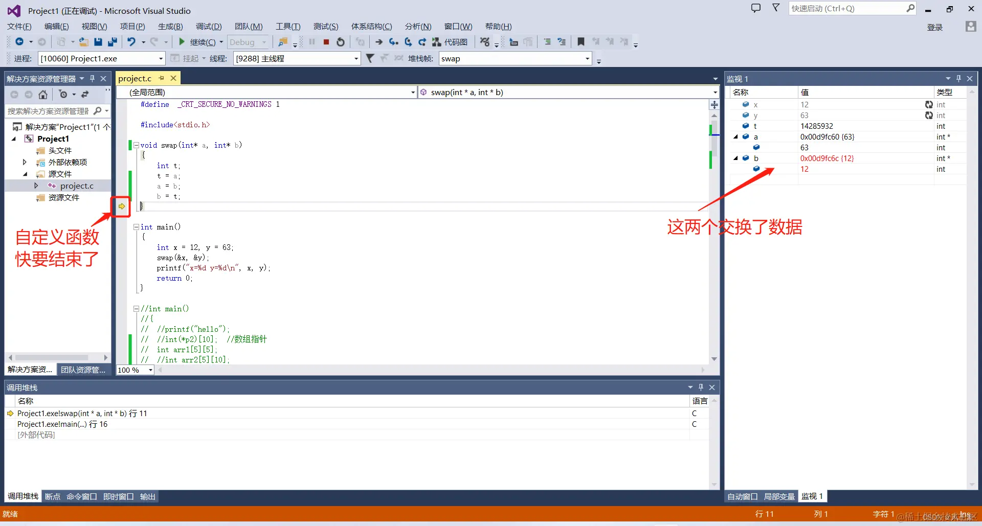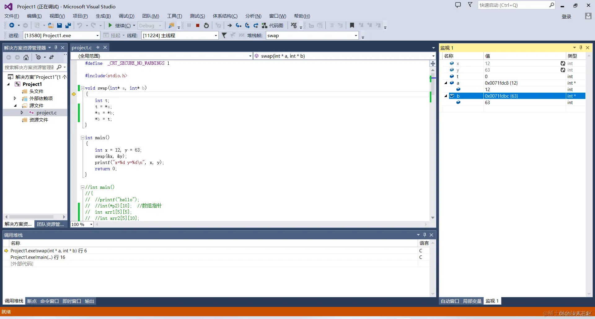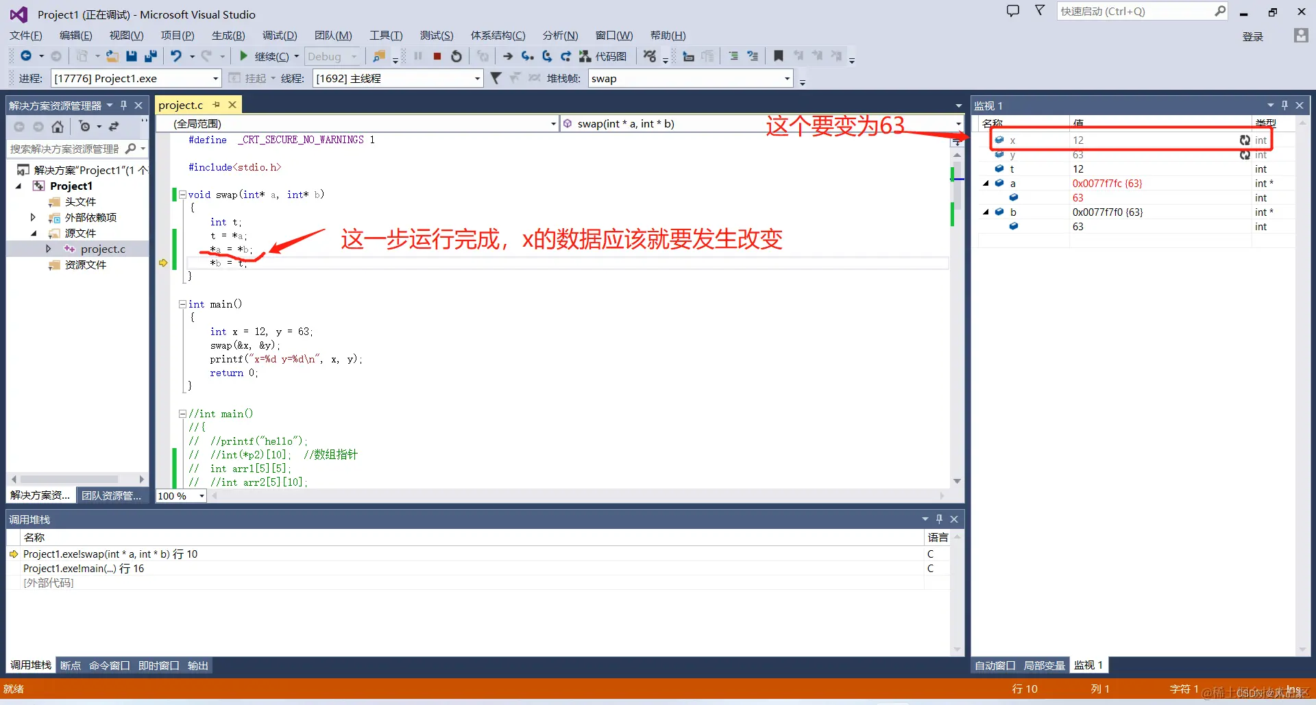 因为我们进行指针内部数据交换,x也要随着在自定义函数中的逐过程发生变化。但是这里没有,我怀疑是因为这个在自定义函数调试过程,编译器不会读取实参的数据。所以才没有进行实时变化。