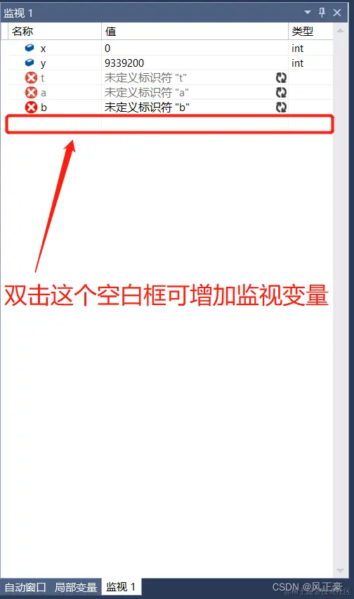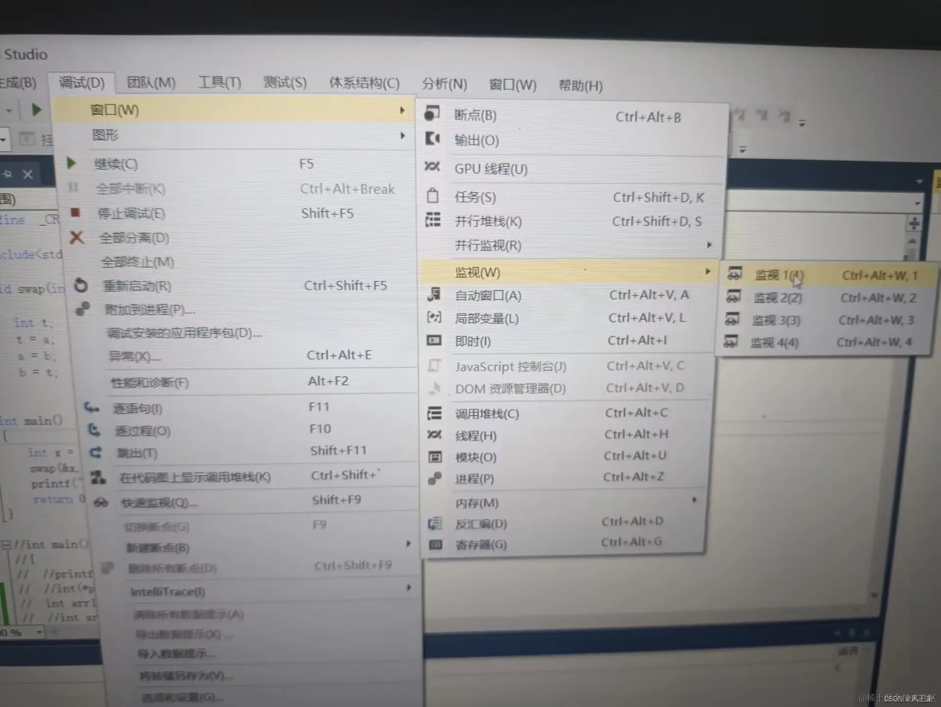 (2)窗口->监视->监视1, 打开监视窗口。(注意,这个必须在调试模式下才有)