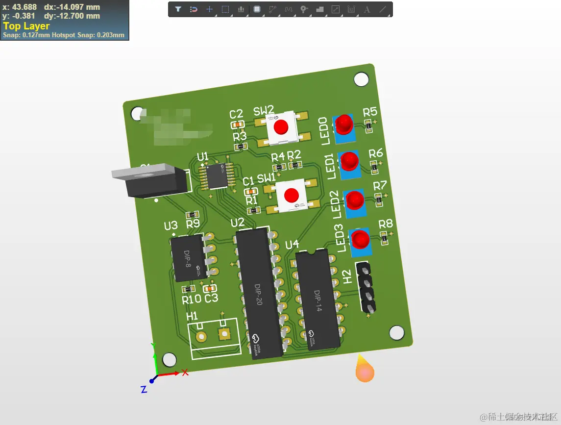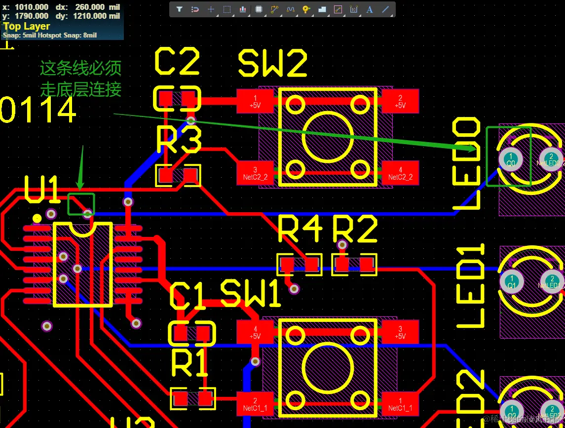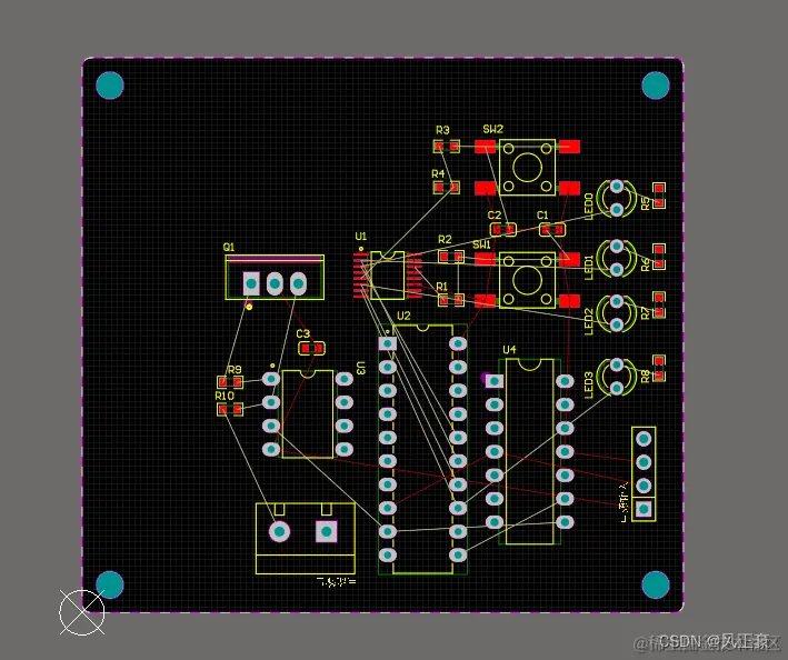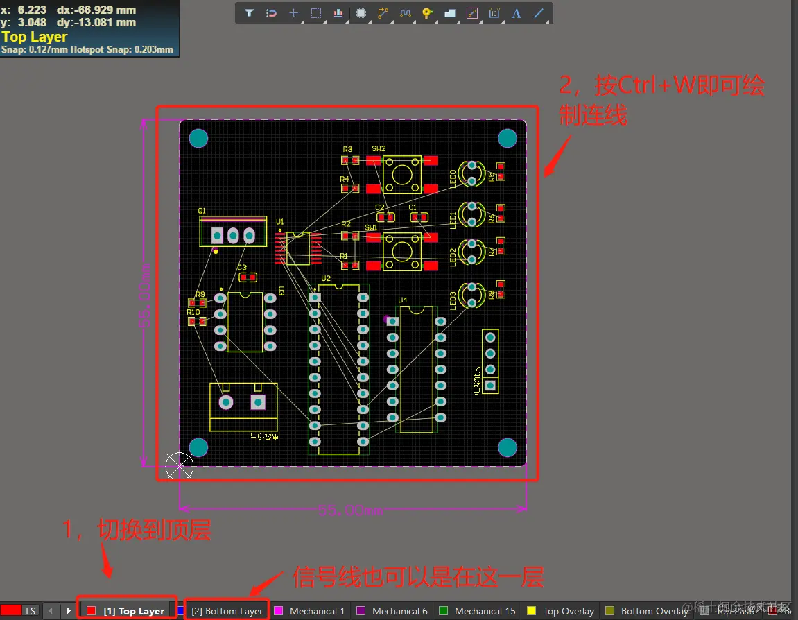 (2)绘制两层板的时候,信号线只能在顶层(Top Layer),也可以是在底层(Bottom Layer)。不过信号线尽可能要在同一层中,所以一般信号线都画在顶层。