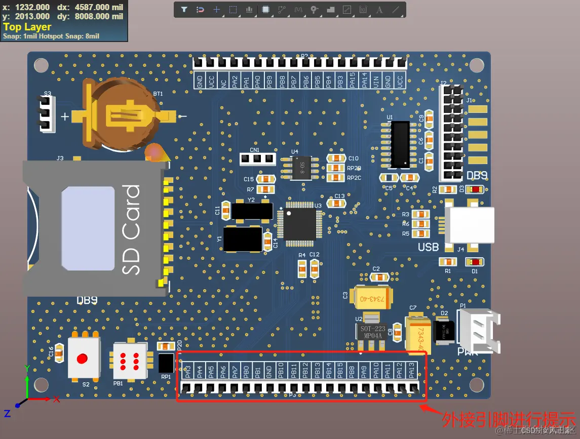 丝印不但可以署名PCB是谁制作的,还可以用于做提示。比如说,一个最小系统板需要向外扩展很多引脚,那么我们就需要在这些引脚上面写上这个外接引脚表示什么。
