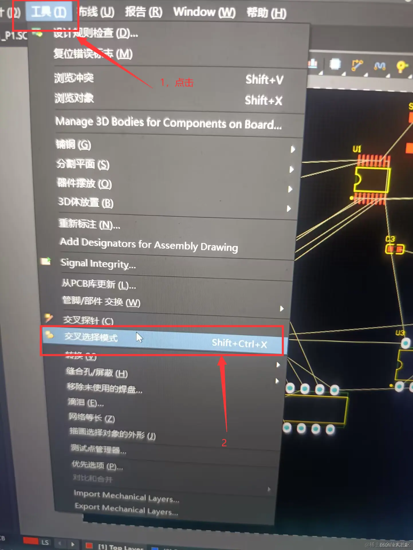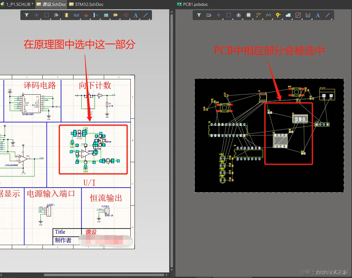 (1)可能有些人不是很清楚这个是啥意思。解释一下,就是说,当你选中原理图中某一部分器件的时候,你在转到PCB的界面的时候,你会发现现在有一部分器件被选中了。