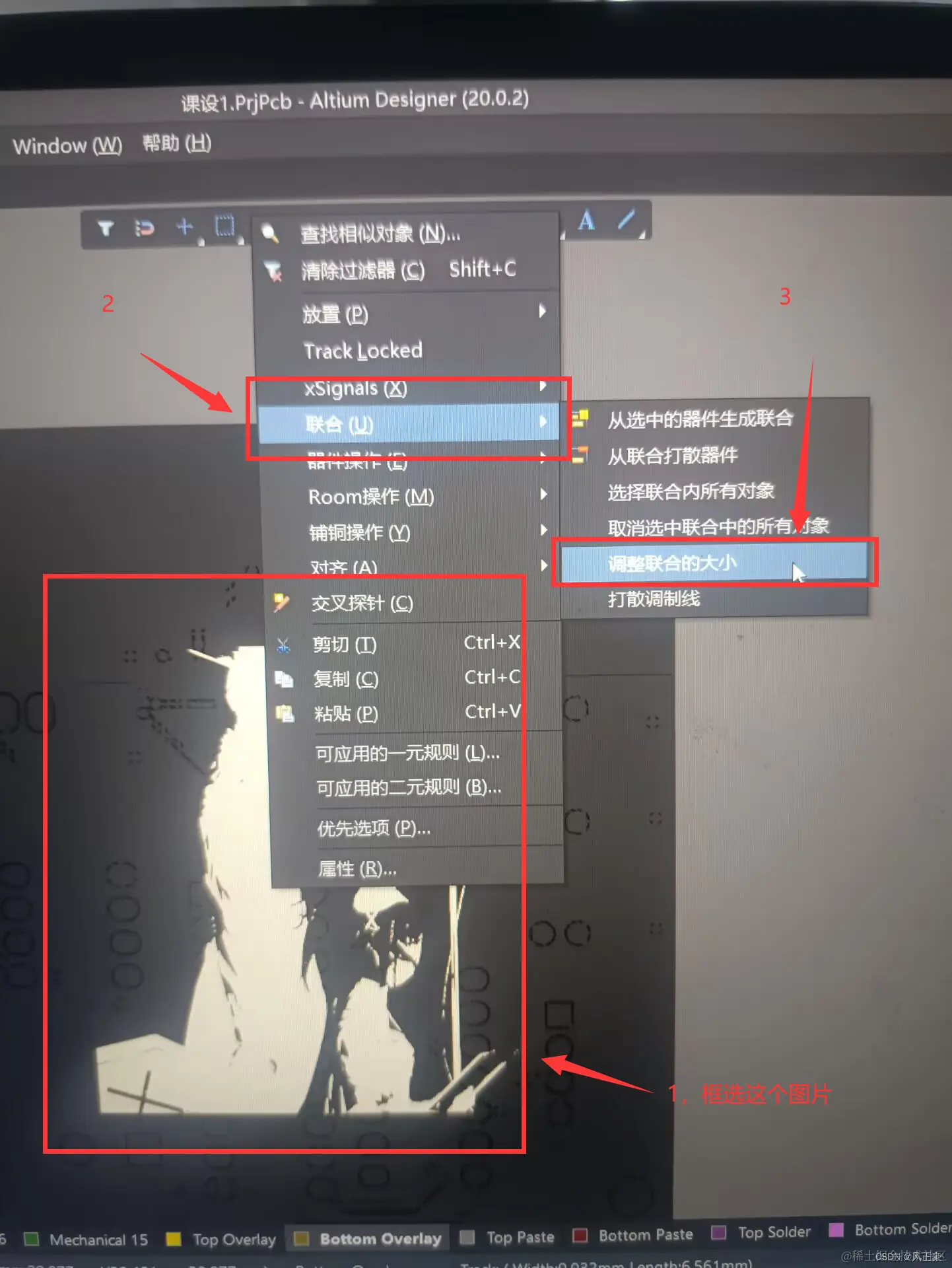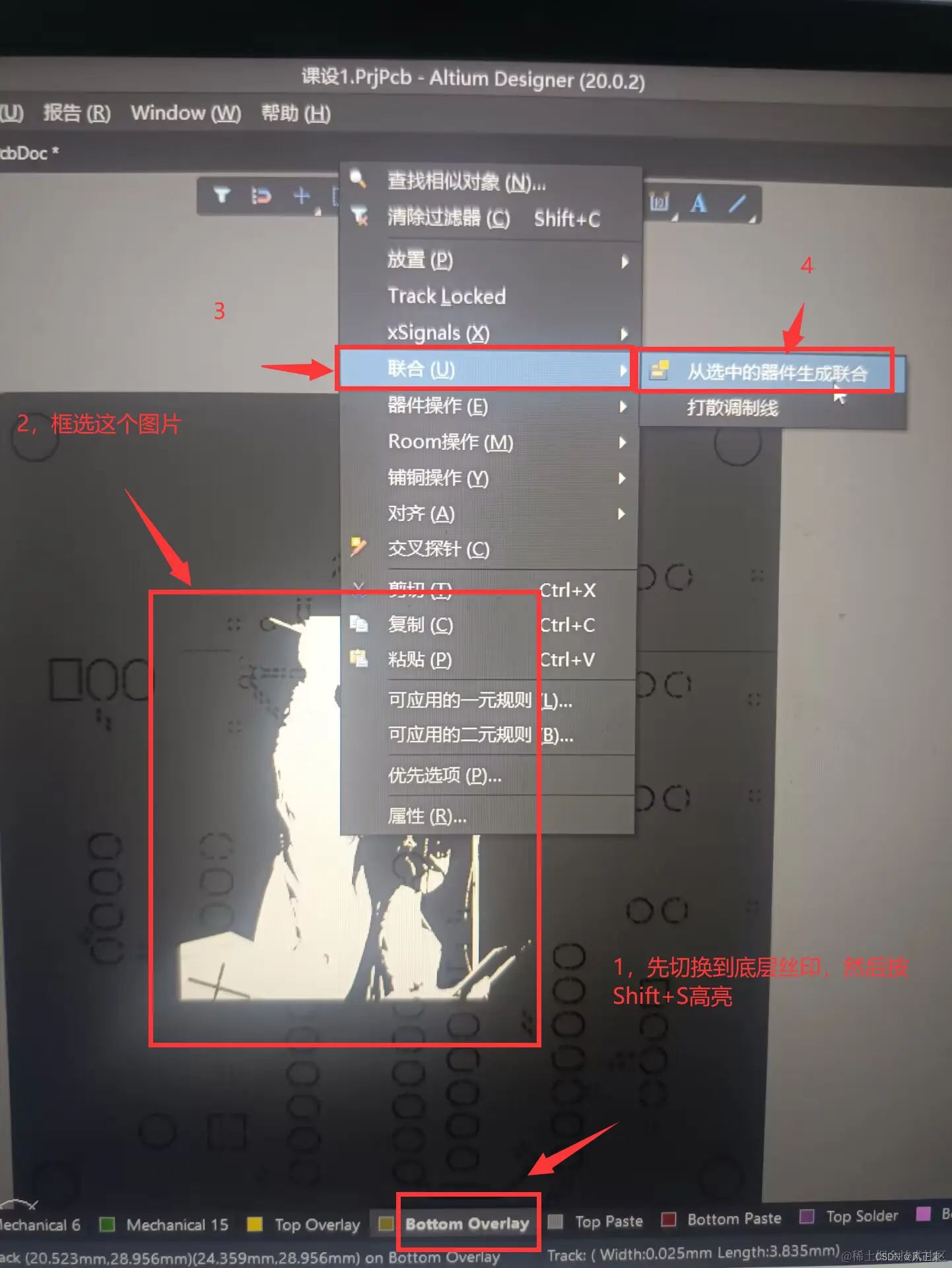 (1)先将整张图片设置为一个联合。我们先需要进入底层丝印—>然后按Shift+S高亮底层丝印—>再联合