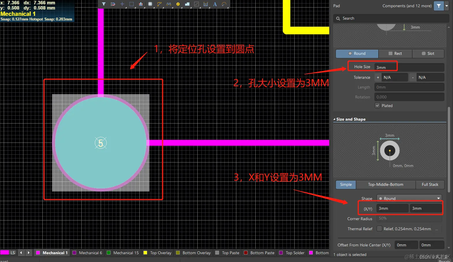(2)因为我们绝大多数都是使用的M3的螺丝进行固定PCB,所以我们的定位孔也设置为3MM。