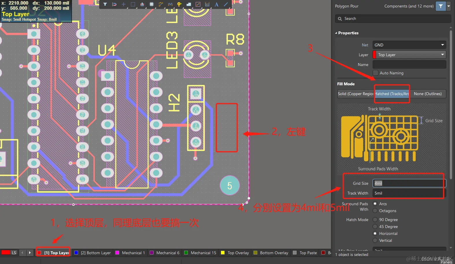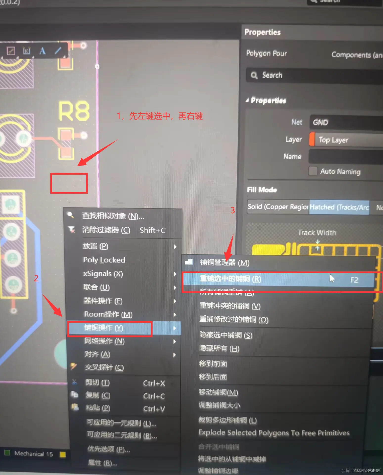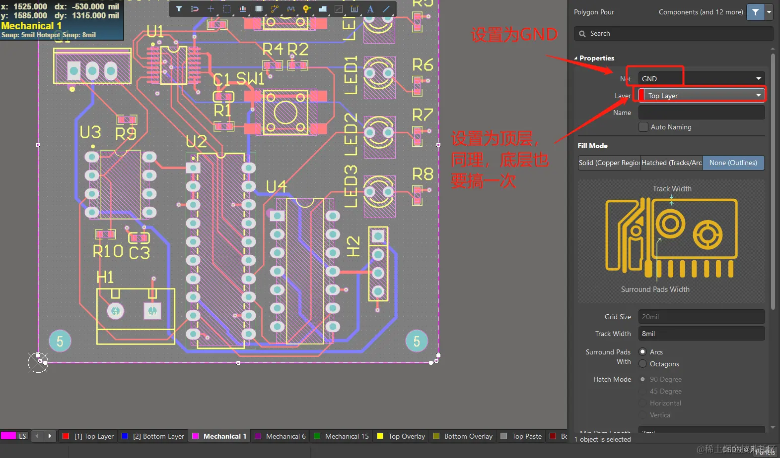 (2)选中铺铜—>Net设置为GND—>底层和顶层都设置一次铺铜