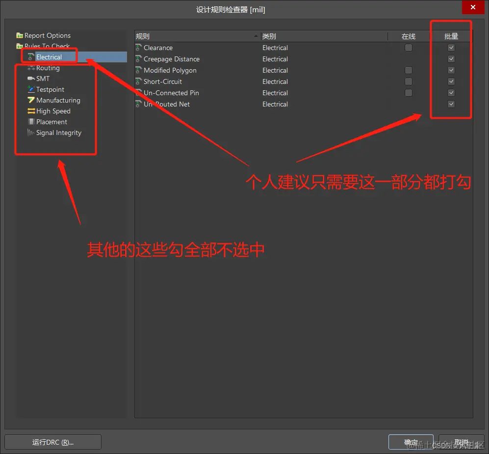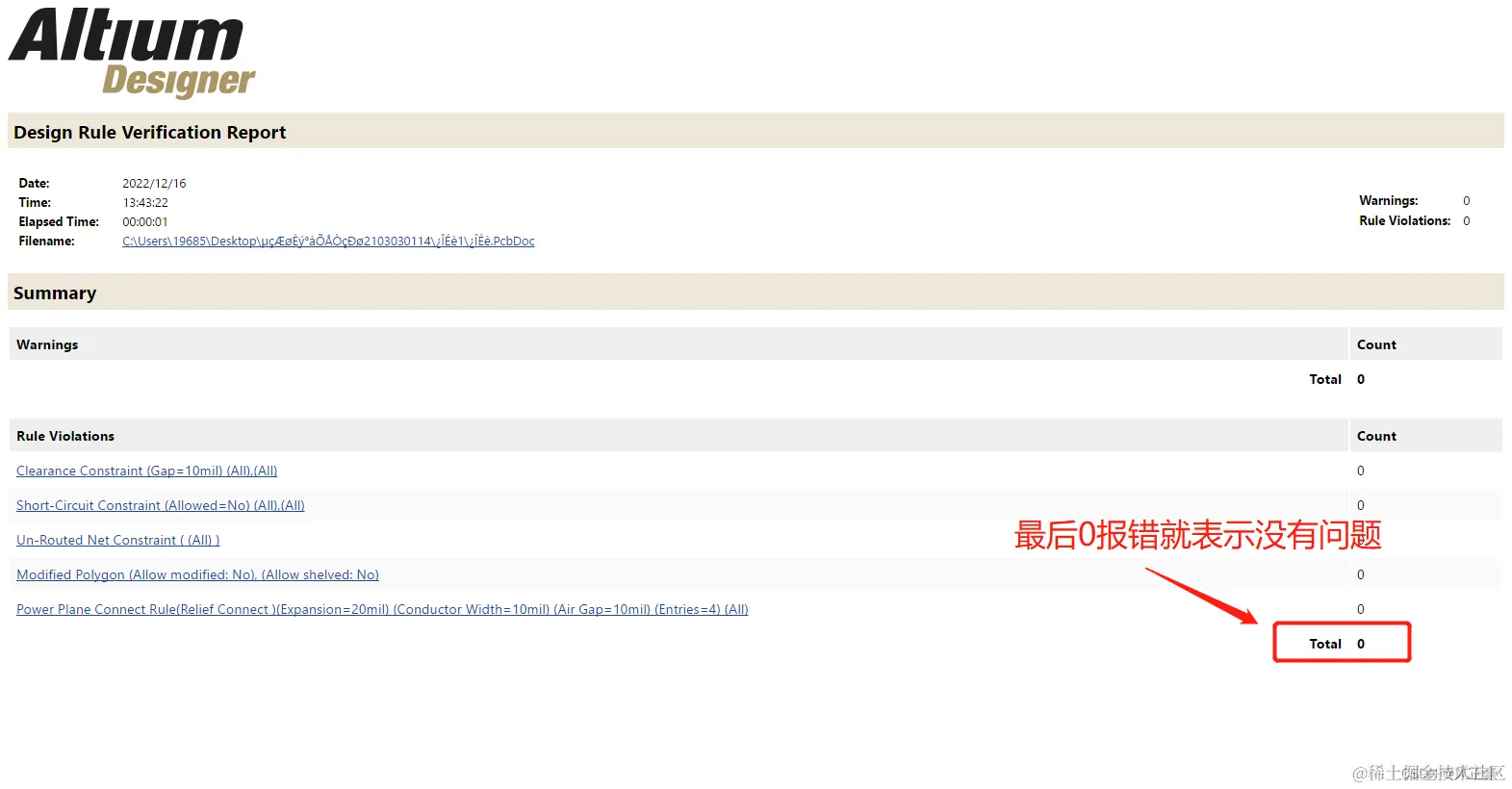 (1)画完PCB之后,我们还需要进行一次DRC检查电路是否有问题。如果DRC无报错则表明无问题。