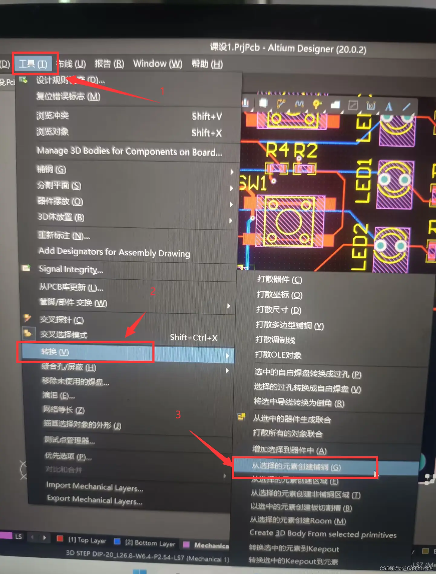 (1)在机械层—>选中板框 —>TAB—>工具—>转换—>从选择的区域创建铺铜