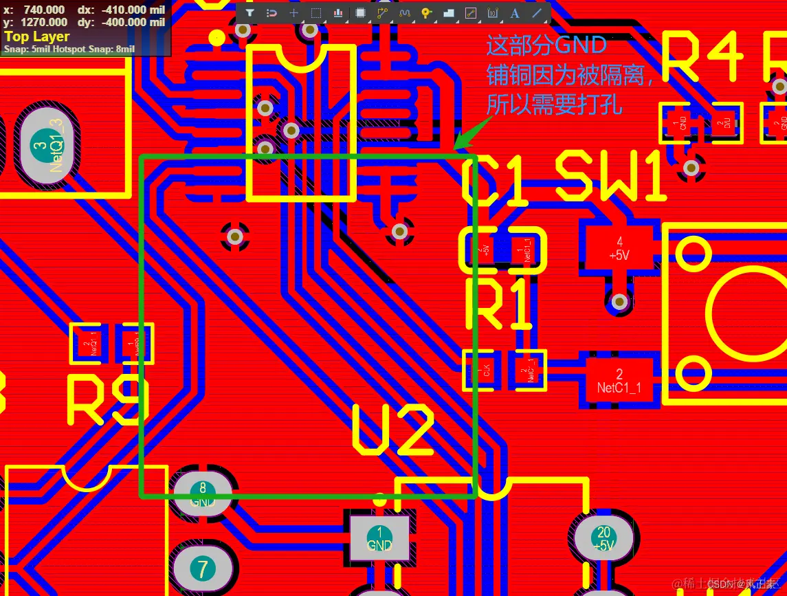 (3)不过需要注意,可能有少部分GND因为被隔离,所以需要打孔。