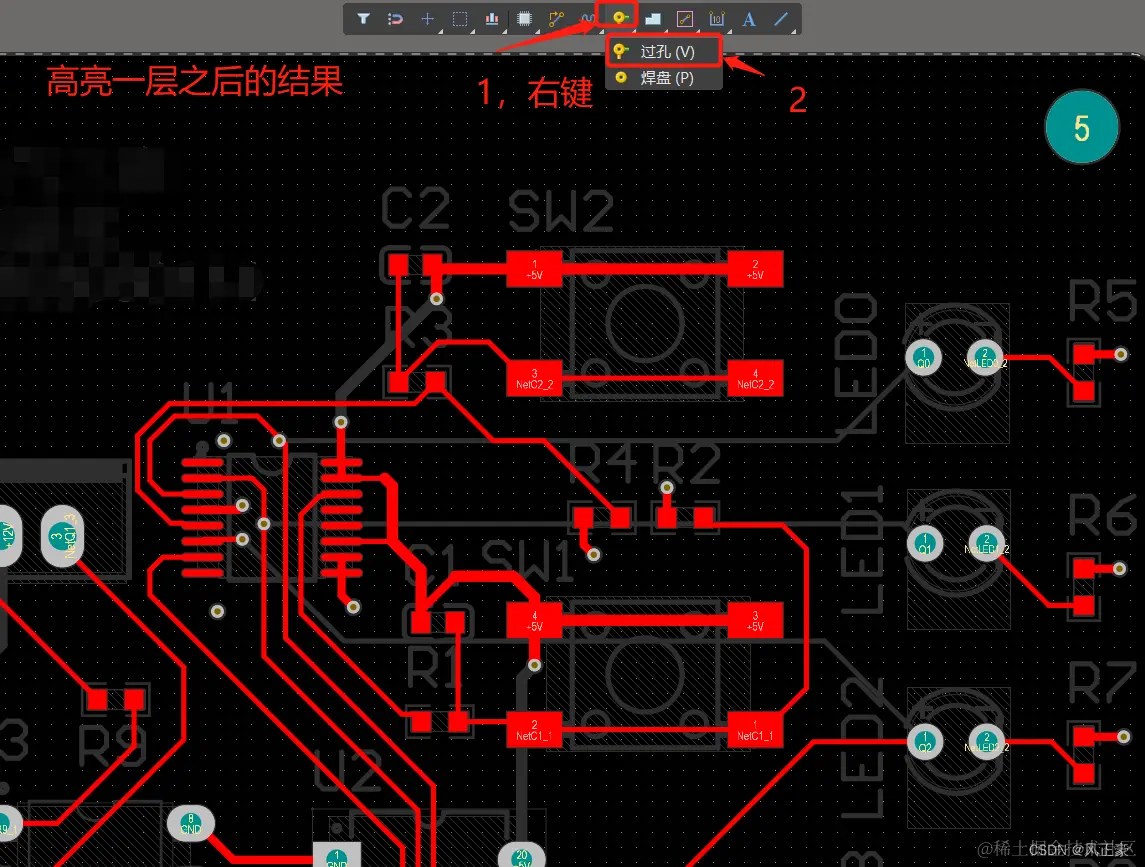 (1)当我们有一条线不能够再同一层连接的时候,就需要过孔,让信号线从底层走来连接两个器件。