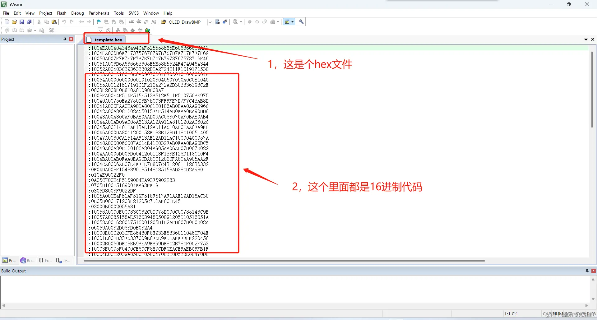 (2)那么这个hex文件是什么东西呢?我们打开hex文件发现,里面都是16进制的数字,而这些代码才是机器真正能够识别的代码。