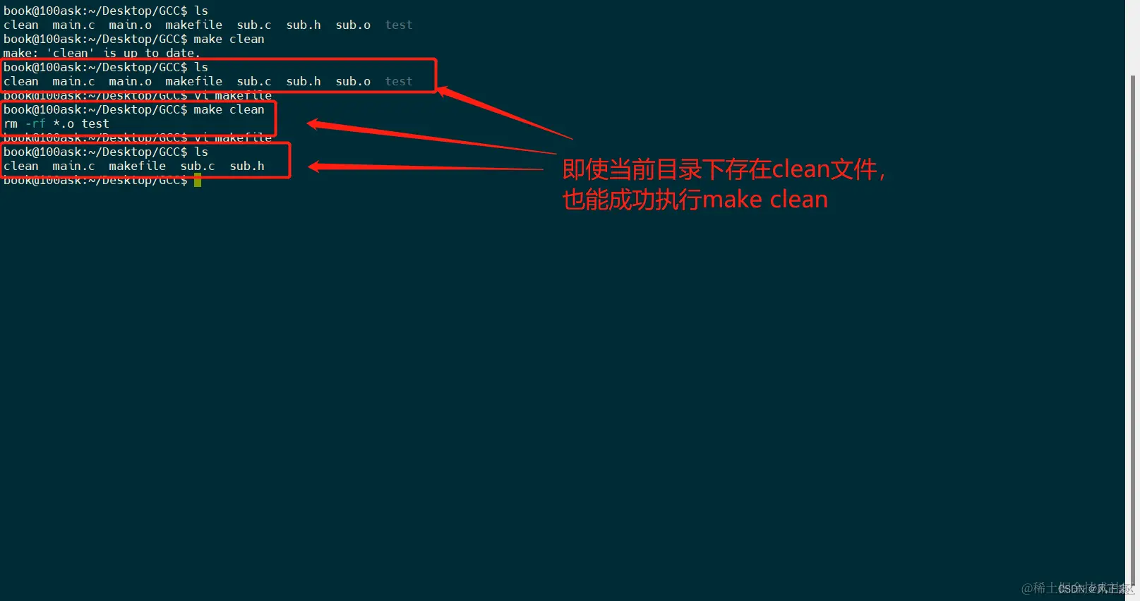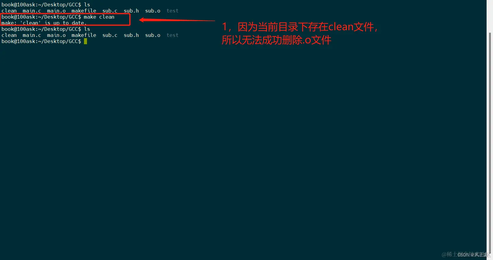 (1)上面我们说了,使用make clean可以将所有编译过程中产生的文件全部删除,但是其中存在问题。假如当前文件夹下也存在一个叫做clean的文件名怎么办呢?