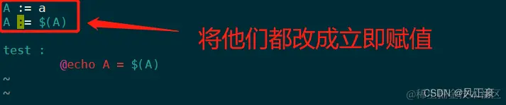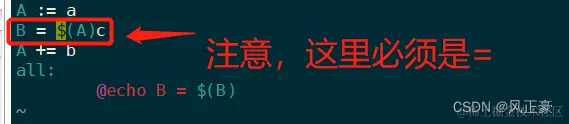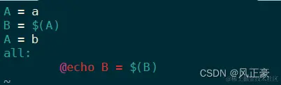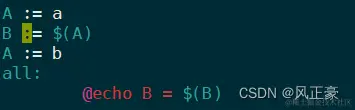 (1)使用“=” 来赋值, 是延迟赋值。按照正常的思路,A=a,那么第二行B就应该是a。但是因为再Makefile中"="是延迟赋值,所以B最终的值是b