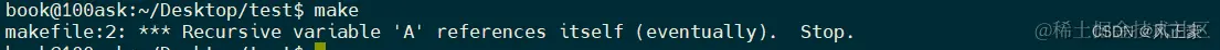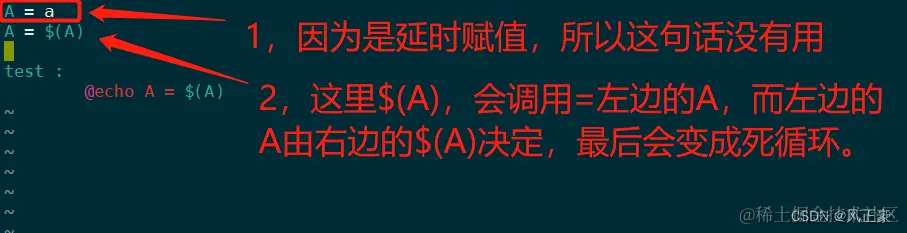 (2)关于延时赋值可能存在的bug,因为=是延时赋值,所以它会将最后一次出实现的值当成实际值。那么就存在一个问题。如果我A = $(A)怎么办呢?因为'='是延时赋值,所以最后一次赋值才是A的真实值,而$(A)作为最后一次赋值,它又要调用A本身,所以最后会变成一个死循环。
