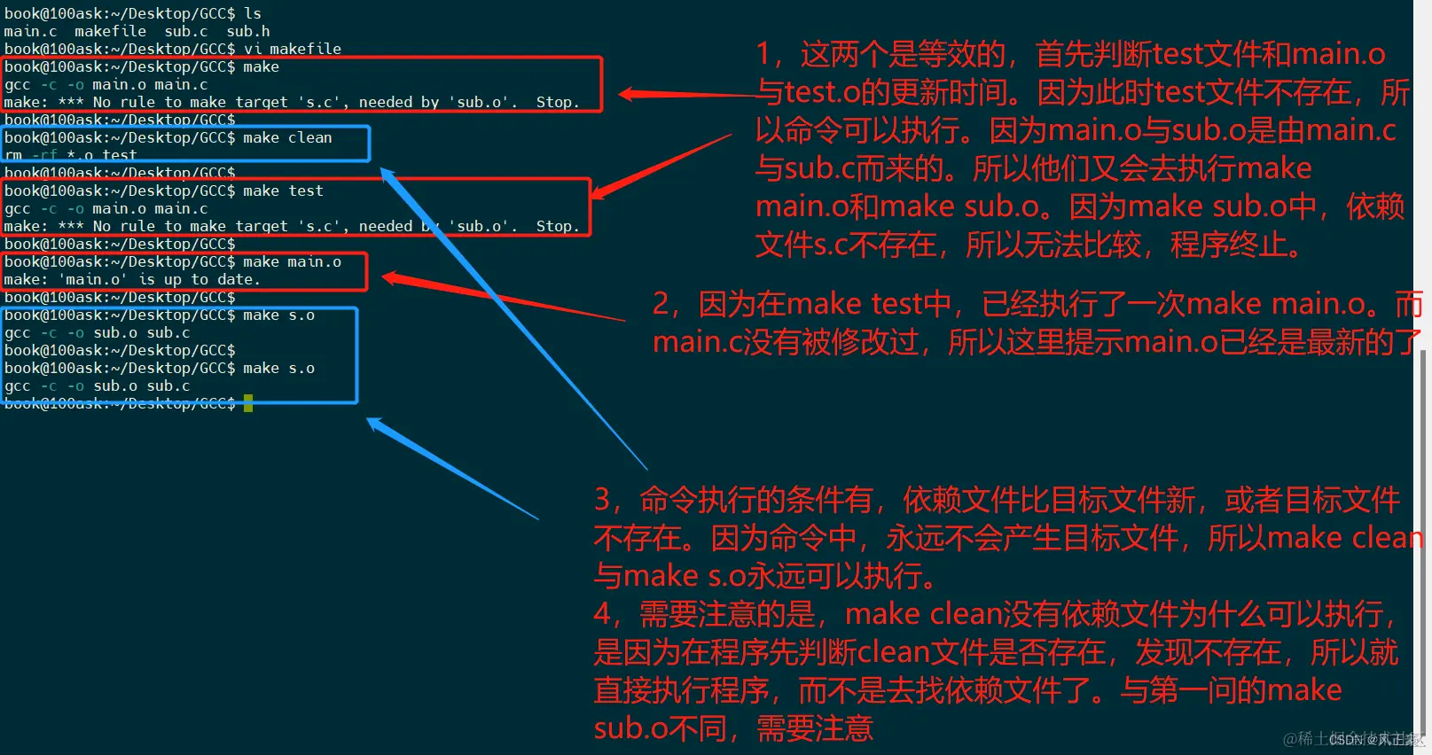 3,命令执行的条件有,依赖文件比目标文件新,或者目标文件不存在。因为命令中,永远不会产生目标文件,所以make cleal与make s.o永远可以执行。