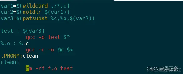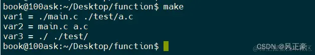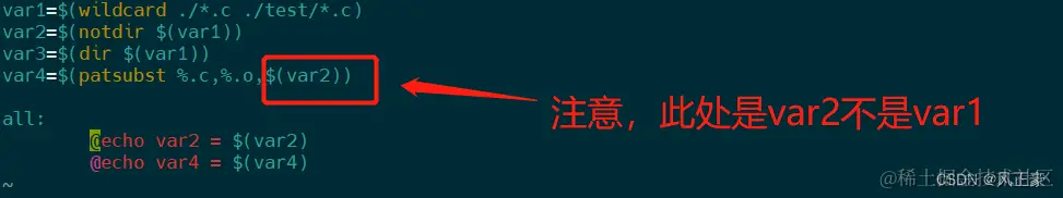 上面讲了这么多,终于到了实操了。首先,我们先展开当前目录下的所有.c文件,然后将这些.c文件的前面的目录去除,之后再将.c替换成.o( 注意,实际的文件名没有被替换)。最后将var3的值放在test之后即可。