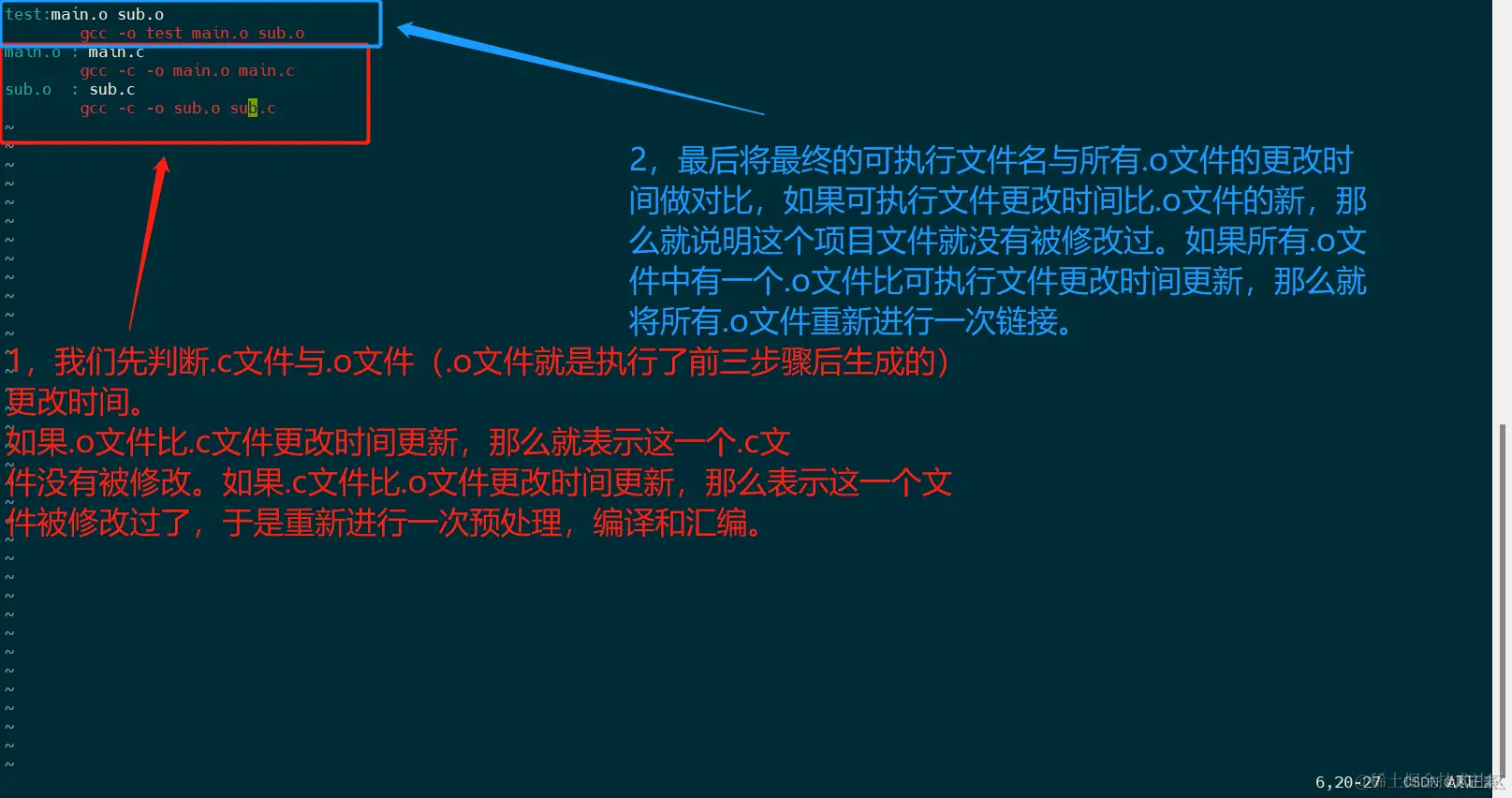 如果.o文件比.c文件更改时间更新,那么就表示这一个.c文件没有被修改。如果.c文件比.o文件更改时间更新,那么表示这一个文件被修改过了,于是重新进行一次预处理,编译和汇编。