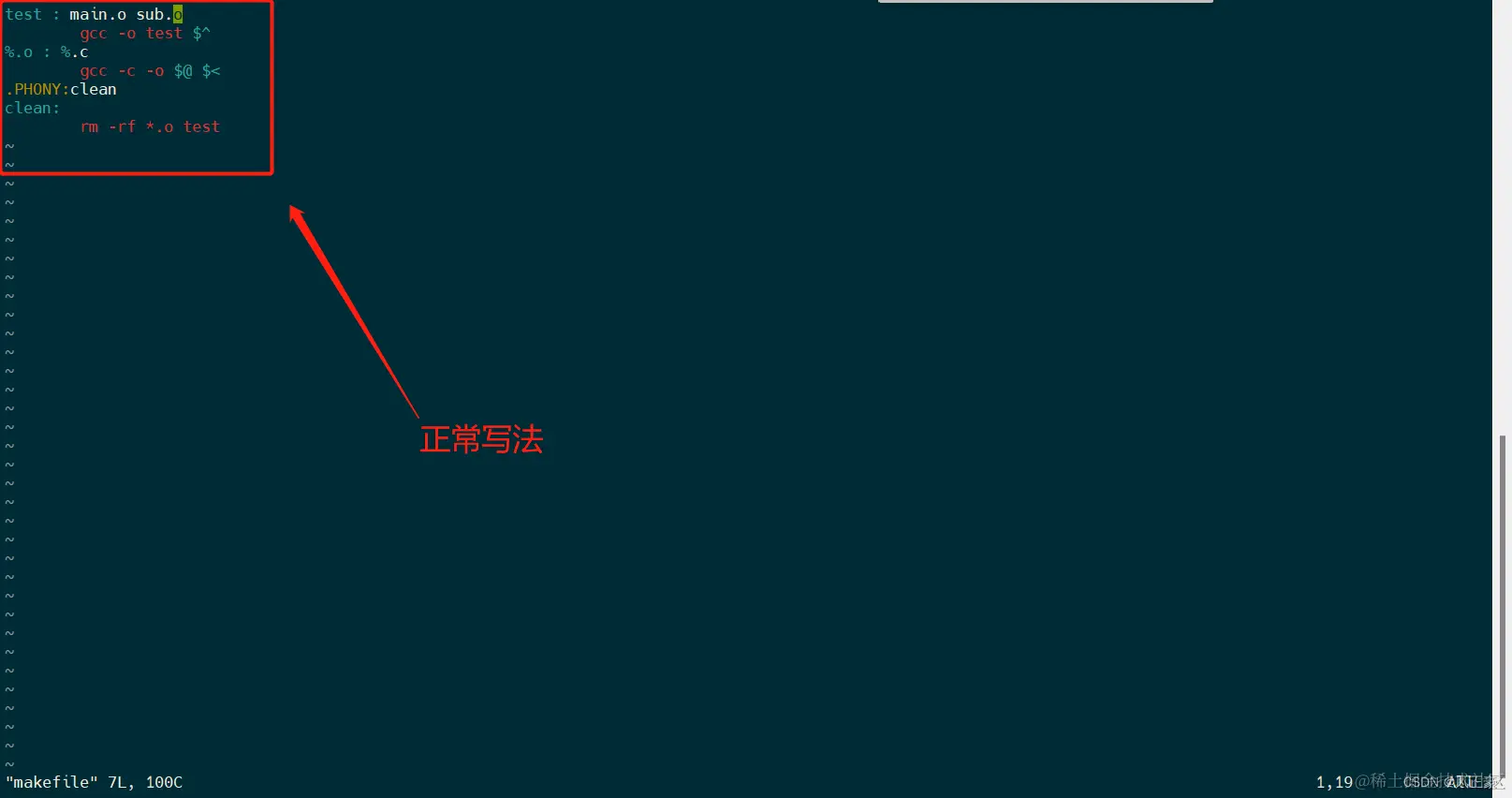 (2)于是我们可以使用通配符和自动化变量,比如前面的main.o和sub.o都可以统一是使用%.o表示,main.c和sub.c统一使用%.c表示。