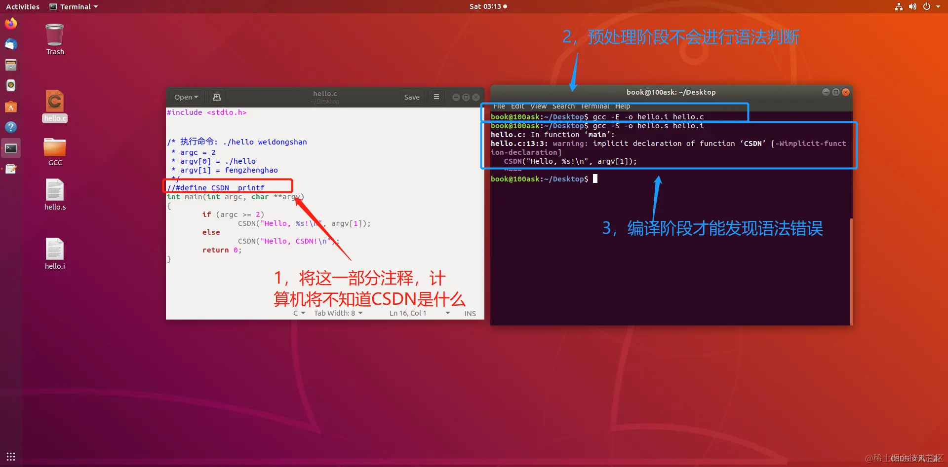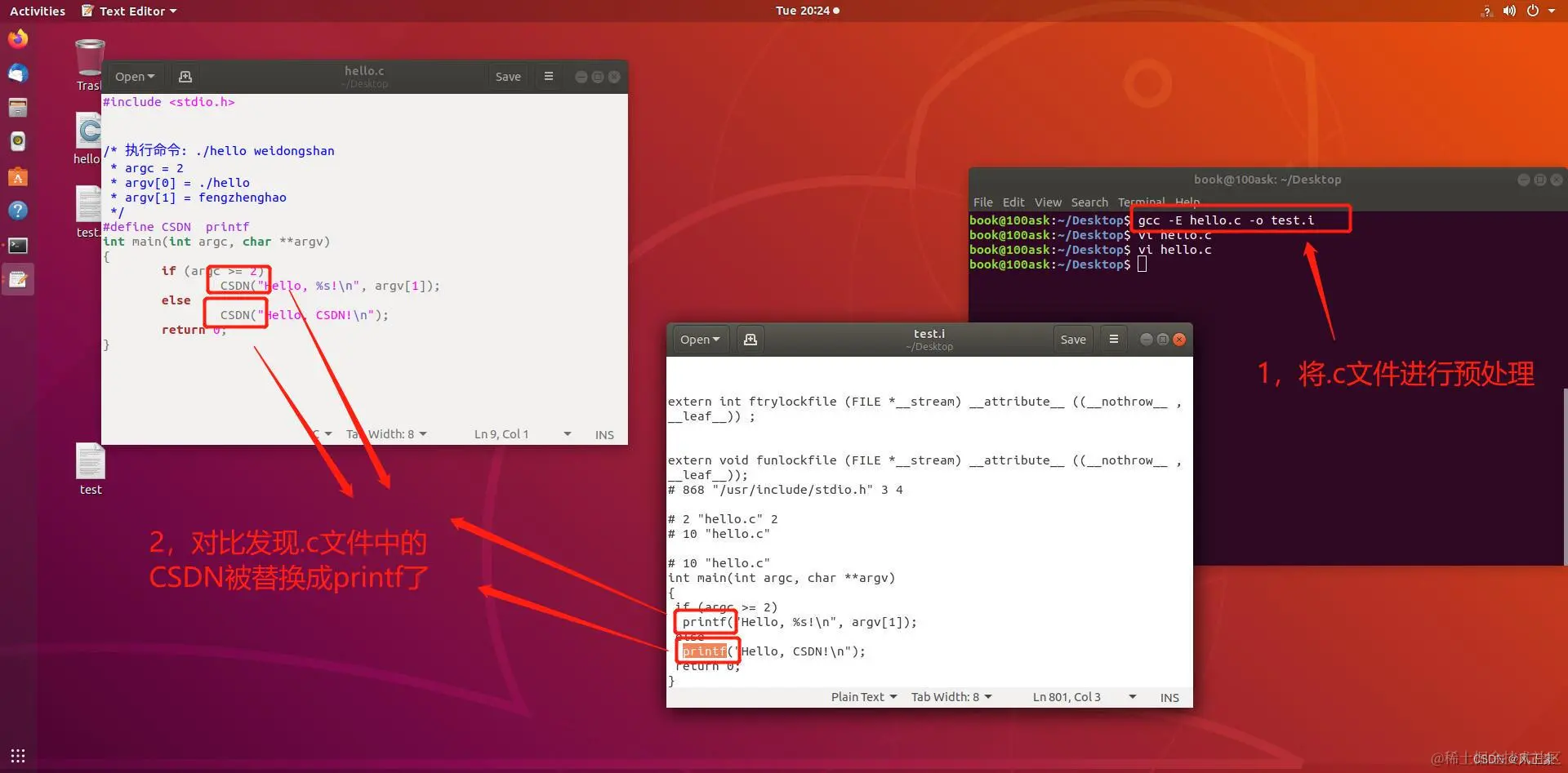 <2> 宏定义展开。比如我们此刻宏定义了printf为CSDN,所以在.i文件中CSDN部分变成了printf。