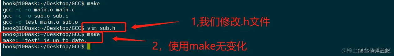 我们学完上面的,感觉一切OK了。但是有没有发现一件事情,就是如果我们没有修改.c文件,而只是修改了.h文件。那么执行make,它会自己改变吗?