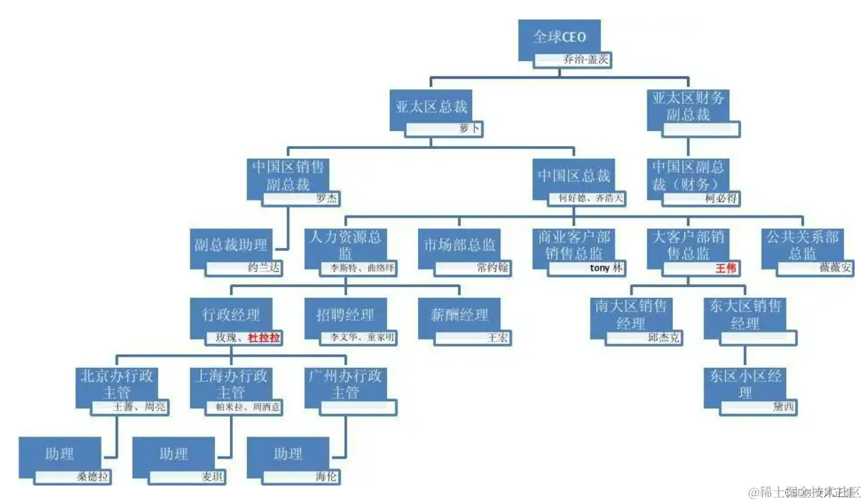 (2)例如如下的公司关系图,一个老板,老板下面有多个总裁,总裁下面再细分。是呈现一个对多个的关系。